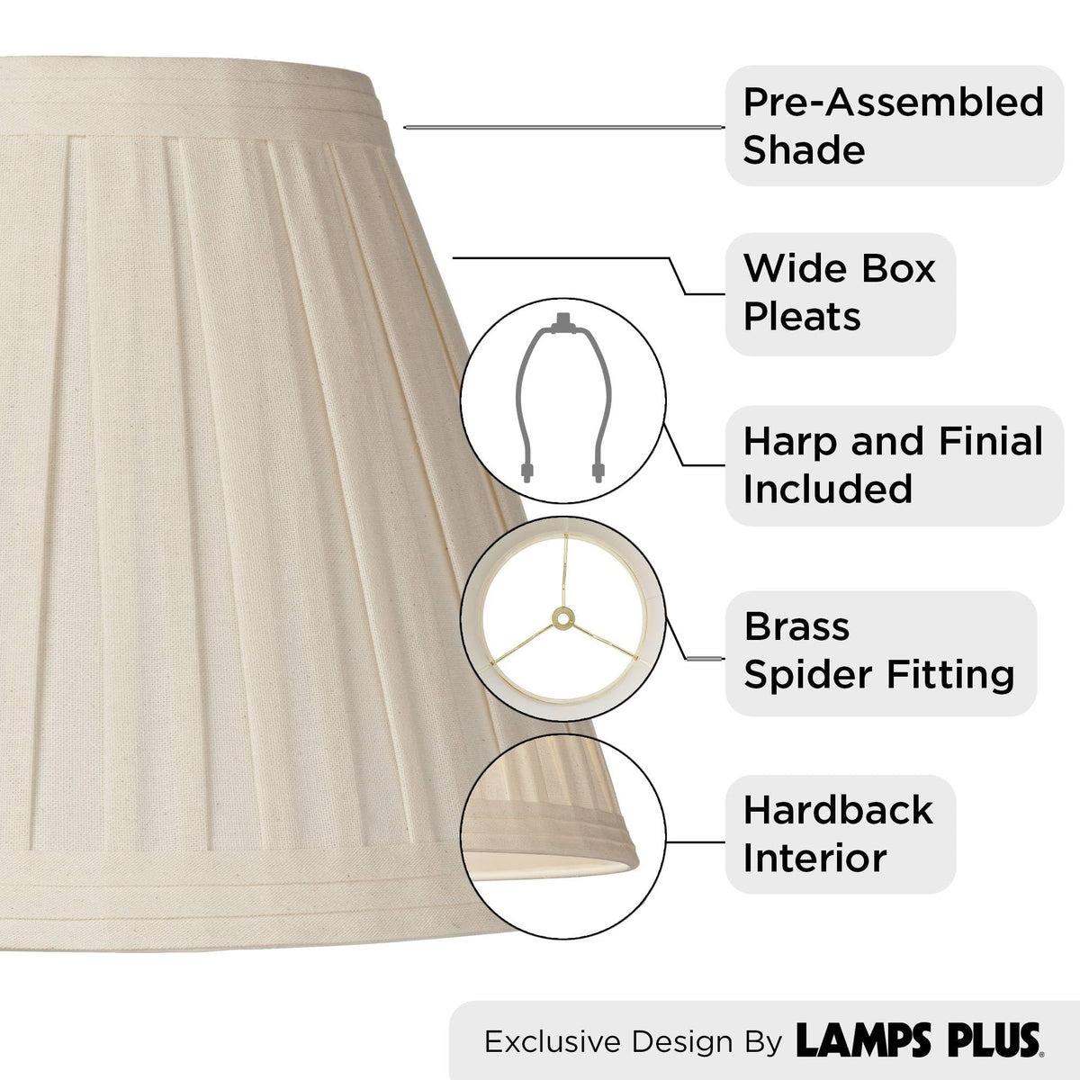 Q: What style of decor is this lamp shade suitable for?A: This lamp shade, with its classic creme linen and wide box pleats, complements traditional and transitional decor styles, making it a versatile choice for various home settings.
