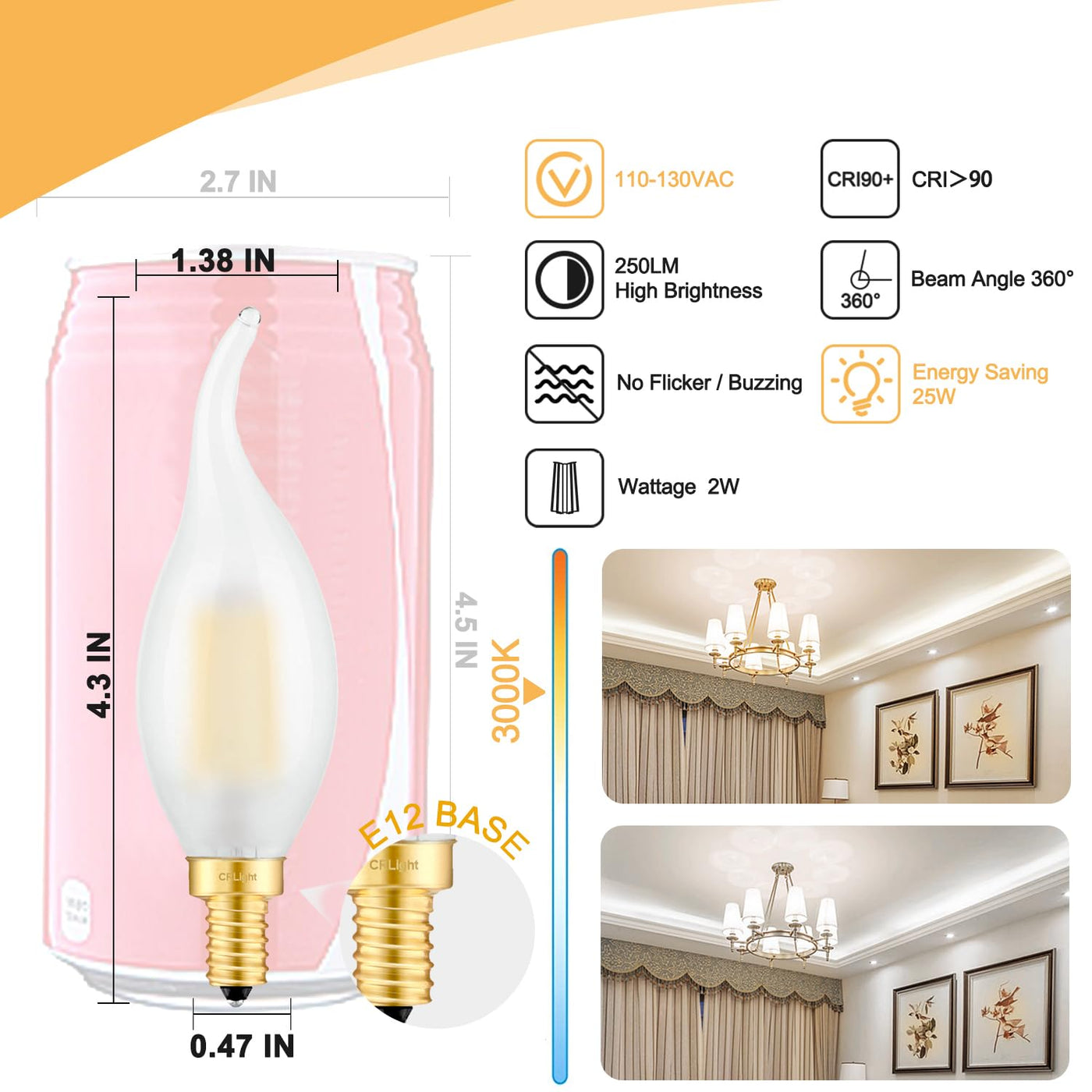 Product Type: C35 2W Dimmable LED Filament Candle E12 Candelabra Base 3000K Frosted (6 Pack) Base Type: E12 Shape Type: C35 Flame Shape Bent Tip Working Voltage: AC 110V-130V Color Temperature: 3000K (Soft White) Incandescent Equivalent: 25W Luminous Intensity: 250LM Beam Angle: 360 Degrees Size: Diameter 1.38 Inch x Height 4.3 Inch Material: Metal and High-Strength Glass Light Source: 2 x LED Filaments Life Span: Average 30000 Hours Lifespan,16 Years Life (5 Hours per Day) Mercury-free, No UV, No Hum, No Flickering, CE and RoHS Authenticate Please Note: 1.Most traditional incandescent or CFL bulbs dimmer can not be used for LED bulbs dimming, and some poor quality dimmer may cause flicker or not-working, to dimming these LED bulbs, please upgrade your dimmer switches/lamps to support LED bulbs. 2.In LED industry,there is no unified technical specification, different bulbs and LED dimmers usually are designed by different technology, so some kinds of LED dimmer are not compatible with CRLight's DIMMABLE LED bulbs, especially smart dimmers and switches.