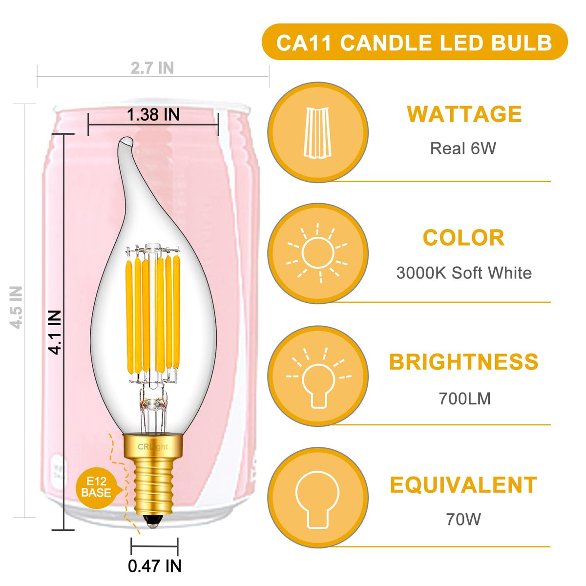 Q: What type of base does this bulb use?A: The CRLight 6W LED Candelabra Bulb features an E12 candelabra base, making it suitable for a variety of chandelier and decorative fixtures.
