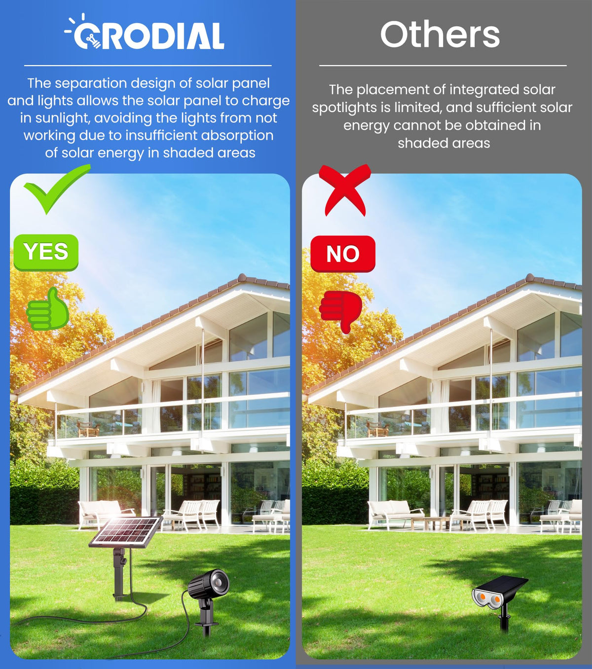 Q: Can these solar lights be installed in shaded areas?A: Yes, the CRODIAL Solar Spot Lights can be installed in shaded areas, thanks to the independently adjustable solar panel. This design allows the solar panel to be positioned in direct sunlight while the lights can be placed in shaded spots, ensuring optimal charging and performance.