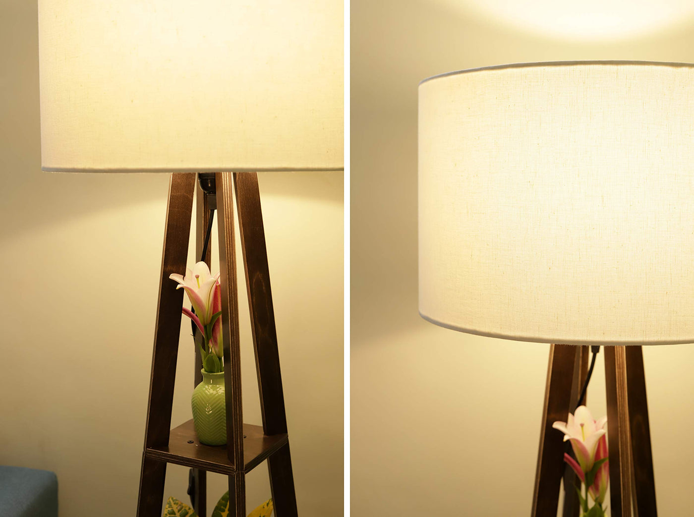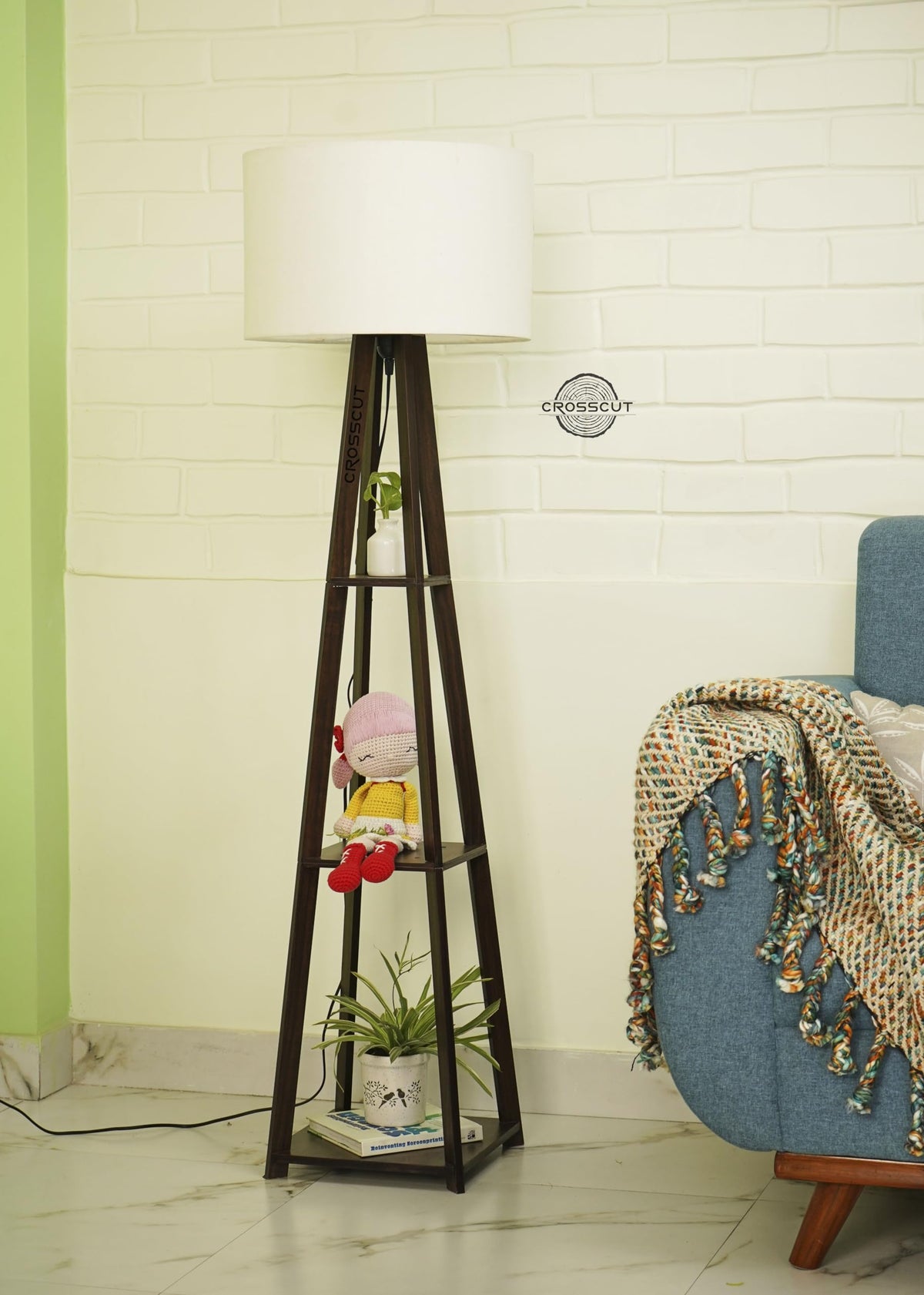 Crosscut Furniture Wooden Floor Lamp with shelves in Dark Finish (Cotton White). LED bulb included