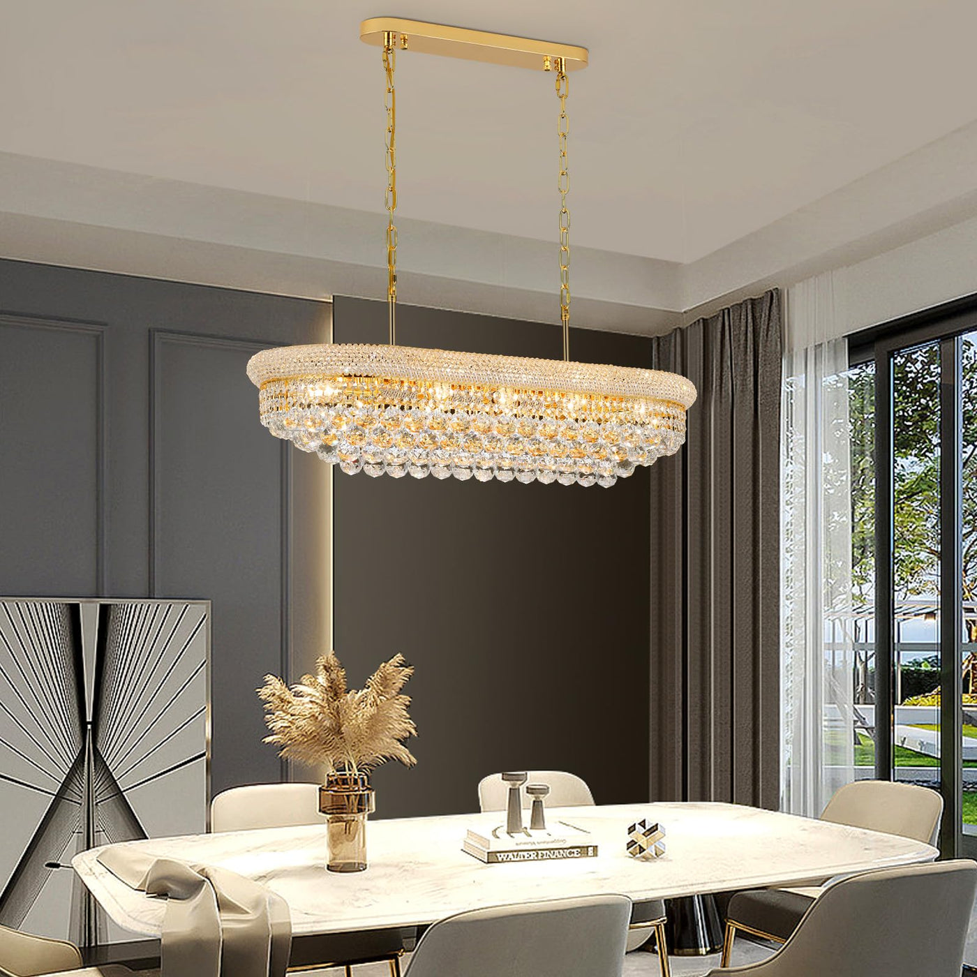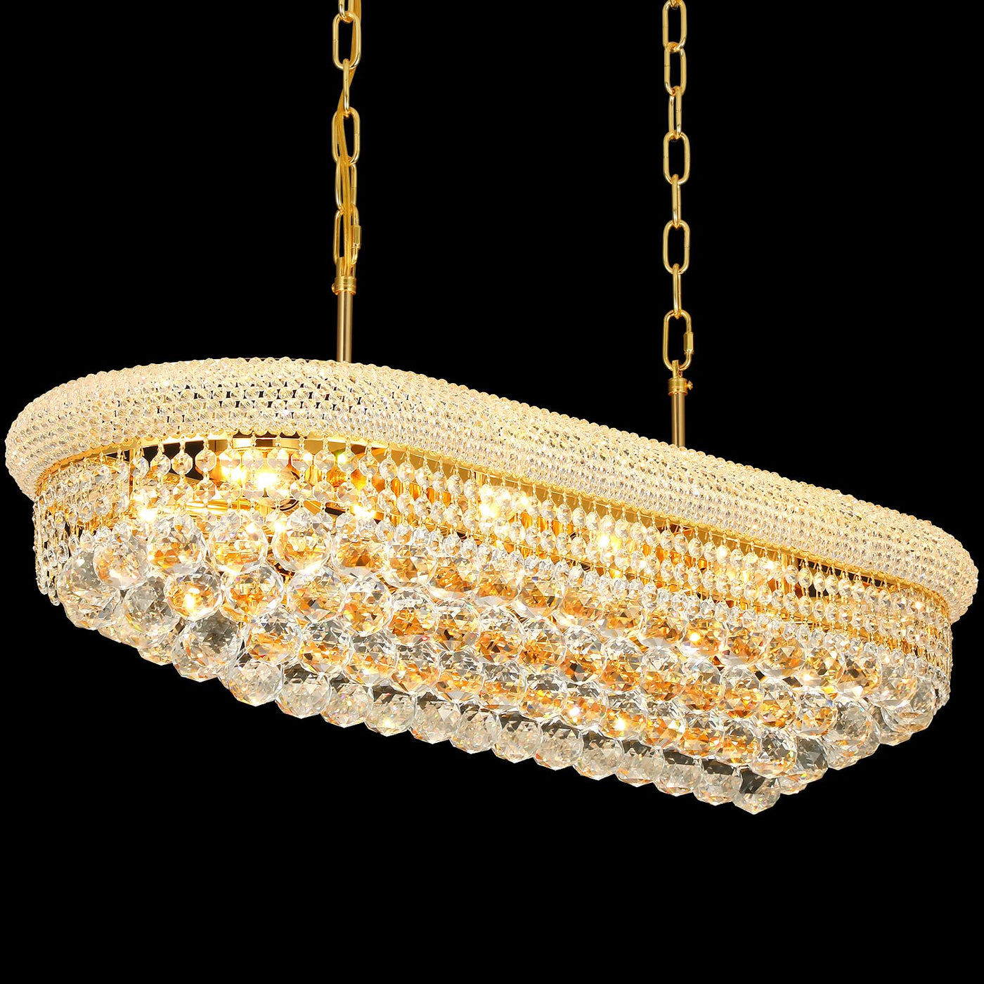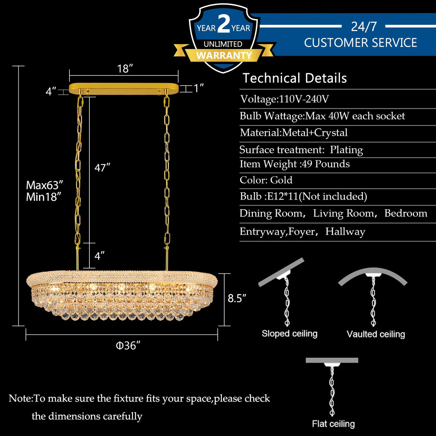 Empire Style Design:This Crystal Chandeliers For Dining Room Is Made Of K9 Crystals When You Turn On The Light ItS Like Opening A French Romantic Journey The Light Refracts A Dreamy Light Through The Crystals Creating A Noble And Charming Atmosphere Chandeliers Size:This Empire Crystal Chandeliers Has A Diameter Of 36 Inches The Whole Light Hangs At A Maximum Height Of 63 Inches A Minimum Of 18 Inches And Weighs 49 Pounds. We Have More Colors And Sizes To Choose Height Adjustable:The Package Of Dining Room Chandelier Includes Two 39.4 Inches Chandelier Chain You Can Adjust The Chain According To The Height You Need To Install It Is Very Convenient And Fits Your Ceiling Perfectly Dimmable:This stylish Crystal Chandeliers Requires 11*E12 Base Bulbs (40 Watts Maximum Power Per Bulb) If You Use Dimmable Bulbs And Dimmers This Kitchen Island Chandeliers Is Dimmable. (All Bulbs And Dimmers Are Not Included) Applicable Scene:This Gold Crystal Chandeliers Combines stylish And French Empire Style The Recommended Use Area Is 200-300 Ft2 It Can Be Used As A Dining Room Light Fixtures Over Table And It Can Also Be Used In The Living Room Kitchen Island Bar Etc Installation:This Kitchen Island Light Fixtures Package Comes With Detailed Installation Instruction You Just Need To Follow The Installation Instructions In The Package To Assemble And Hang The Crystal The Installation Process Is Very Easy To Understand Customer Service:We Provide All Customers With Satisfactory Service If You Have Any Incomprehension About The Order Or Product Or Modern Crystal Chandeliers Installation And Other Problems We Will Provide You With Satisfactory Solutions With In 24 Hours