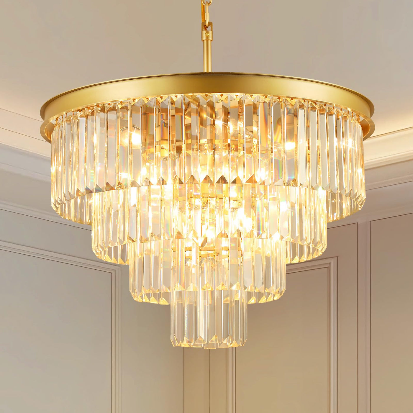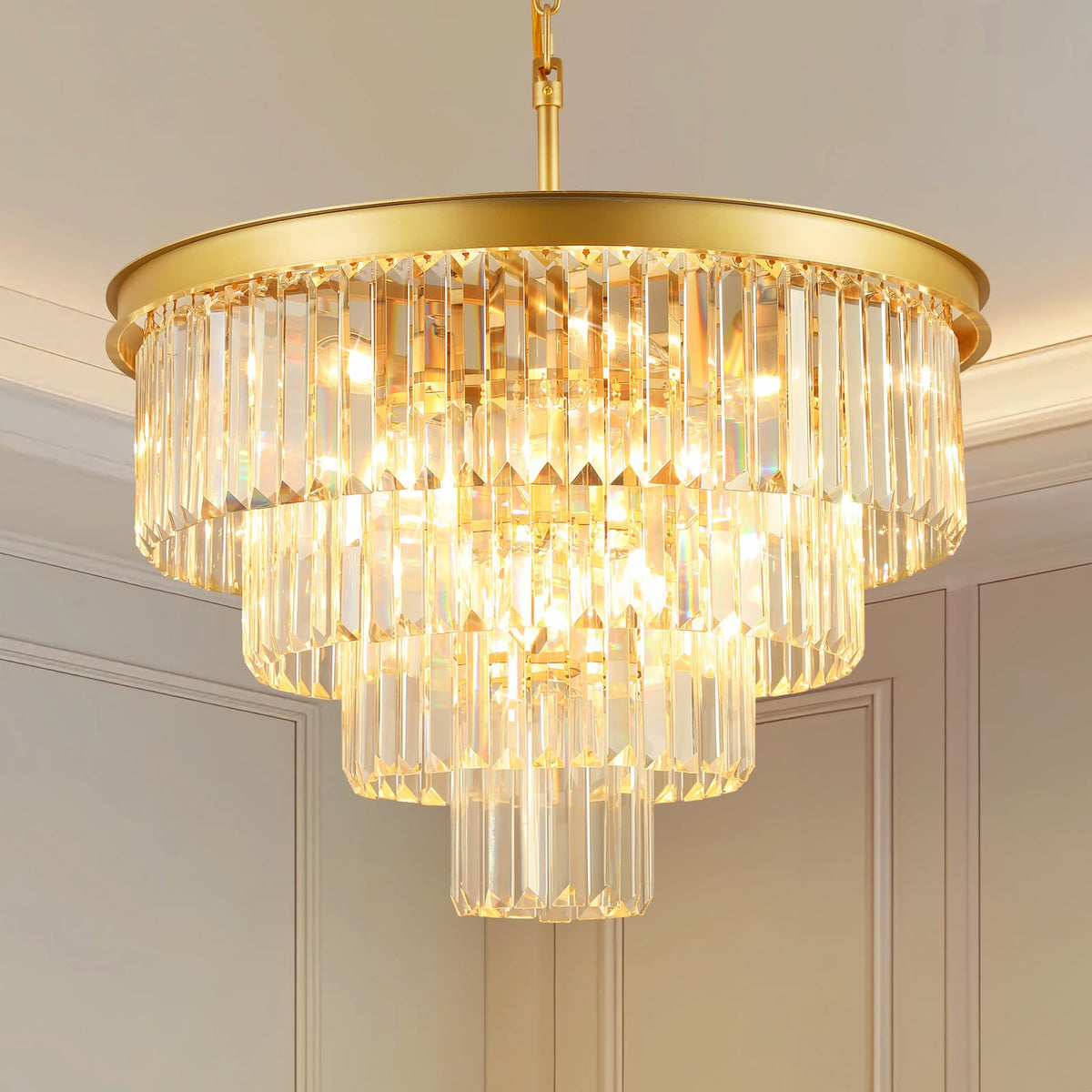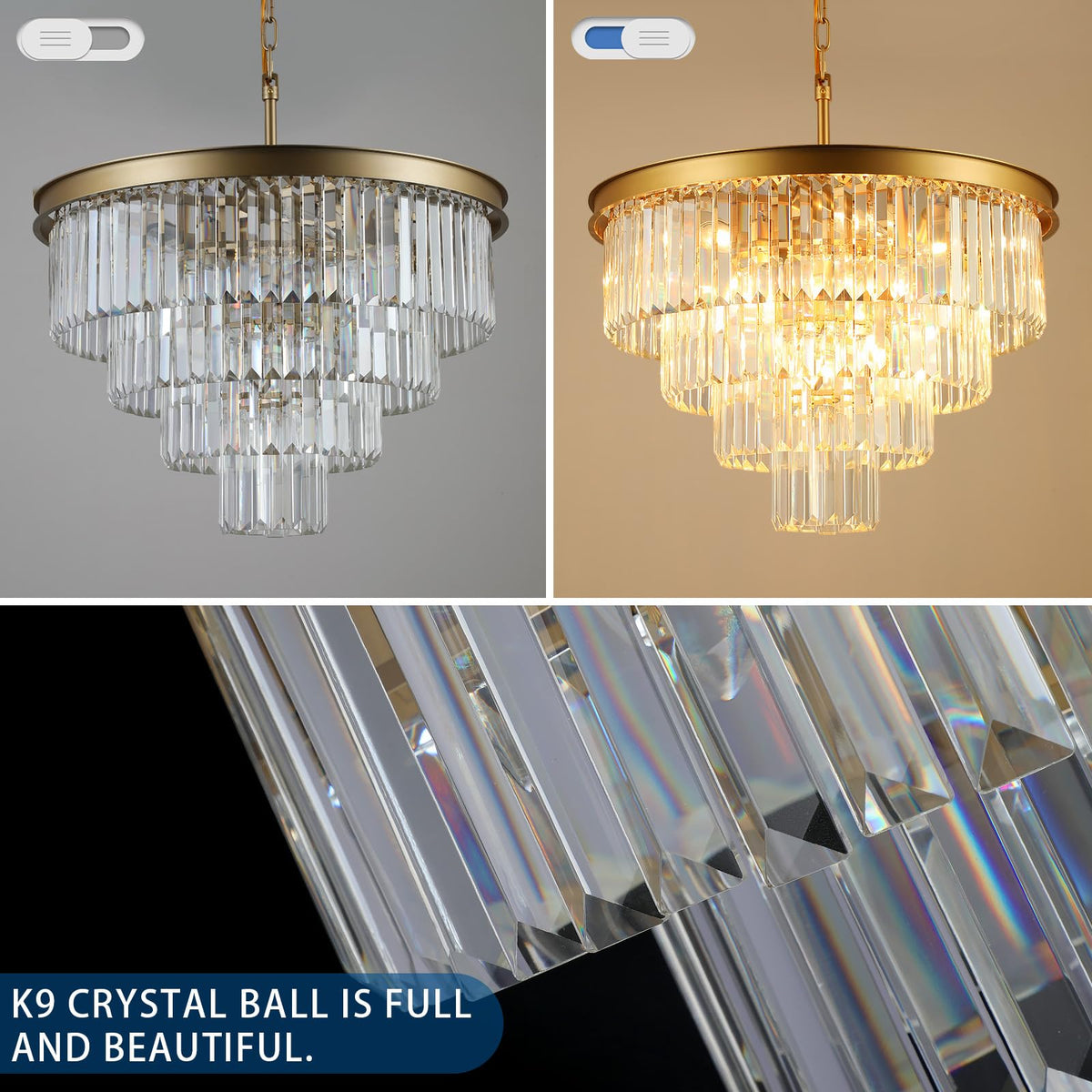 Gold Crystal Chandeliers:This Chandeliers For Dining Room Using K9 Crystal With 4-Tier Crystal Design And Gold Lamp Frame. When You Turn On The Light The Lighting Will Reflect Through The Crystal Adding A Romantic And Unique Atmosphere To Your Room Chandelier Size: This Crystal Chandelier Has A Diameter Of 24 Inches A Maximum Mounting Height Of 71 Inches A Minimum Mounting Height Of 26 Inches And A Weight Of 30 Pounds. We Have More Styles Available For Your Whole House Lighting Needs Height Adjustable: The Package Of This Living Room Chandeliers Contains One 47 Inches Hanging Chains You Can Adjust The Hanging Chains According To The Height You Need To Install Perfect For Your Ceiling Dimmable:This Modern Crystal Chandeliers Compatible With Led Incandescent And Halogen Bulbs With E12 Sockets(40W Max).This Dining Room Chandeliers Can Be Dimmable If You Use A Dimmable Bulb And Compatible Dimmer Switch(Bulbs And Dimmers Not Included) Applicable Scene:This Round Chandeliers Combines Light stylish And Modern Style With A Recommended Use Area Of 250-350 Ft It Can Be Used As A Dining Room Light Fixture Over Table And It Can Also Be Used In The Living Room;Bedroom;Kitchen Island;Bar Etc Easy Installation: The Package Of The Crystal Chandeliers For Dining Room Contains All The Installation Accessories We Also Provide Detailed Installation Instructions Please Follow The Instructions To Install Very Easy Customer Service: We Provide All Customers With Satisfactory Service If You Have Any Incomprehension About The Order Or Product Or Chandelier Light Fixture Installation And Other Problems We Will Provide You With Satisfactory Solutions Within 24 Hours