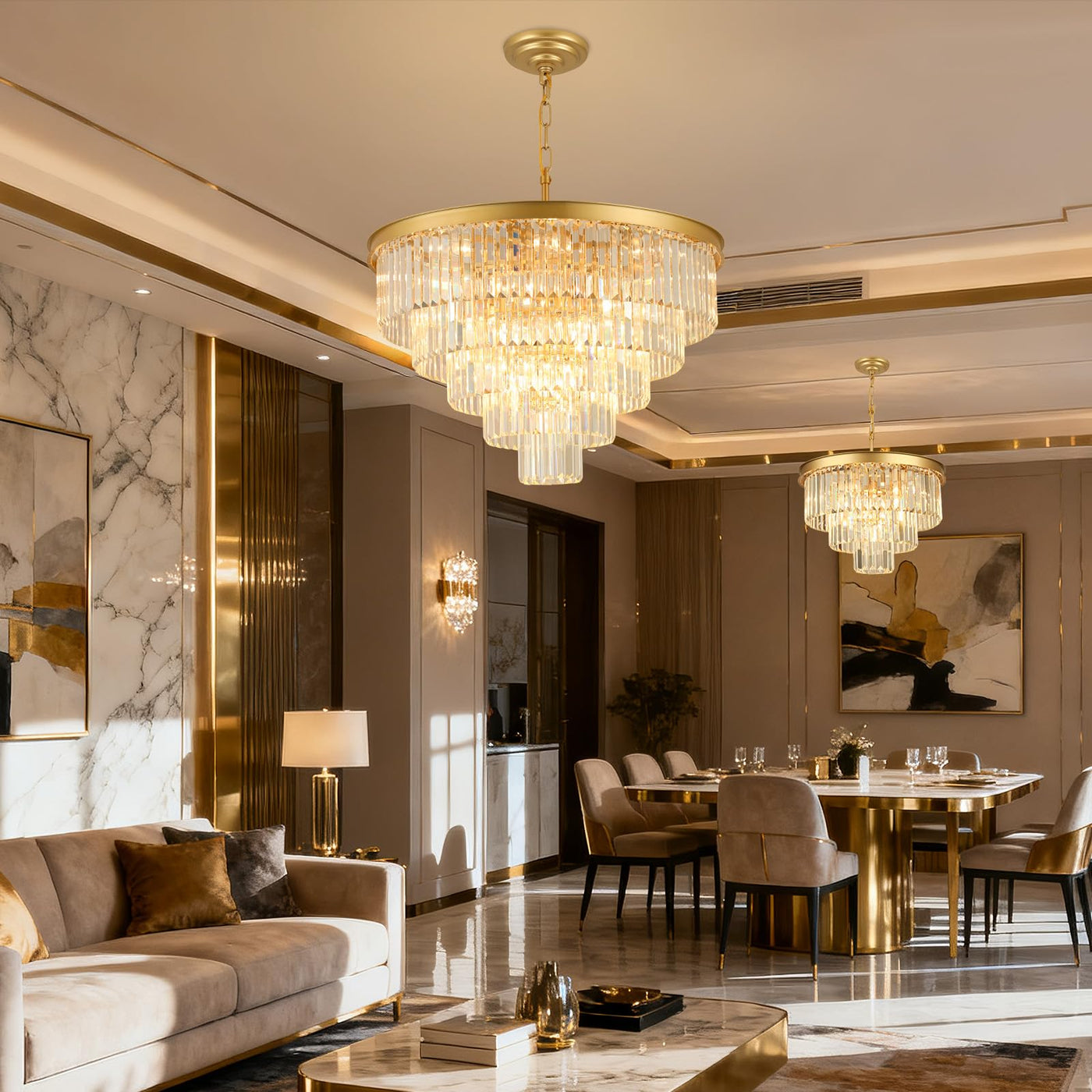 Gold Crystal Chandeliers:This Chandeliers For Living Room Using K9 Crystal With 5-Tier Crystal Design And Gold Lamp Frame. When You Turn On The Light The Lighting Will Reflect Through The Crystal Adding A Romantic And Unique Atmosphere To Your Room Chandelier Size: This Crystal Chandelier Has A Diameter Of 30 Inches A Maximum Mounting Height Of 75 Inches A Minimum Mounting Height Of 28 Inches And A Weight Of 46 Pounds. We Have More Styles Available For Your Whole House Lighting Needs Height Adjustable: The Package Of This Living Room Chandeliers Contains One 47 Inches Hanging Chains You Can Adjust The Hanging Chains According To The Height You Need To Install Perfect For Your Ceiling Dimmable:This Modern Crystal Chandeliers Compatible With Led Incandescent And Halogen Bulbs With E12 Sockets(40W Max).This Dining Room Chandeliers Can Be Dimmable If You Use A Dimmable Bulb And Compatible Dimmer Switch(Bulbs And Dimmers Not Included) Applicable Scene:This Round Chandeliers Combines Light stylish And Modern Style With A Recommended Use Area Of 250-350 Ft It Can Be Used As A Dining Room Light Fixture Over Table And It Can Also Be Used In The Living Room;Bedroom;Kitchen Island;Bar Etc Easy Installation: The Package Of The Crystal Chandeliers For Dining Room Contains All The Installation Accessories We Also Provide Detailed Installation Instructions Please Follow The Instructions To Install Very Easy Customer Service: We Provide All Customers With Satisfactory Service If You Have Any Incomprehension About The Order Or Product Or Chandelier Light Fixture Installation And Other Problems We Will Provide You With Satisfactory Solutions Within 24 Hours