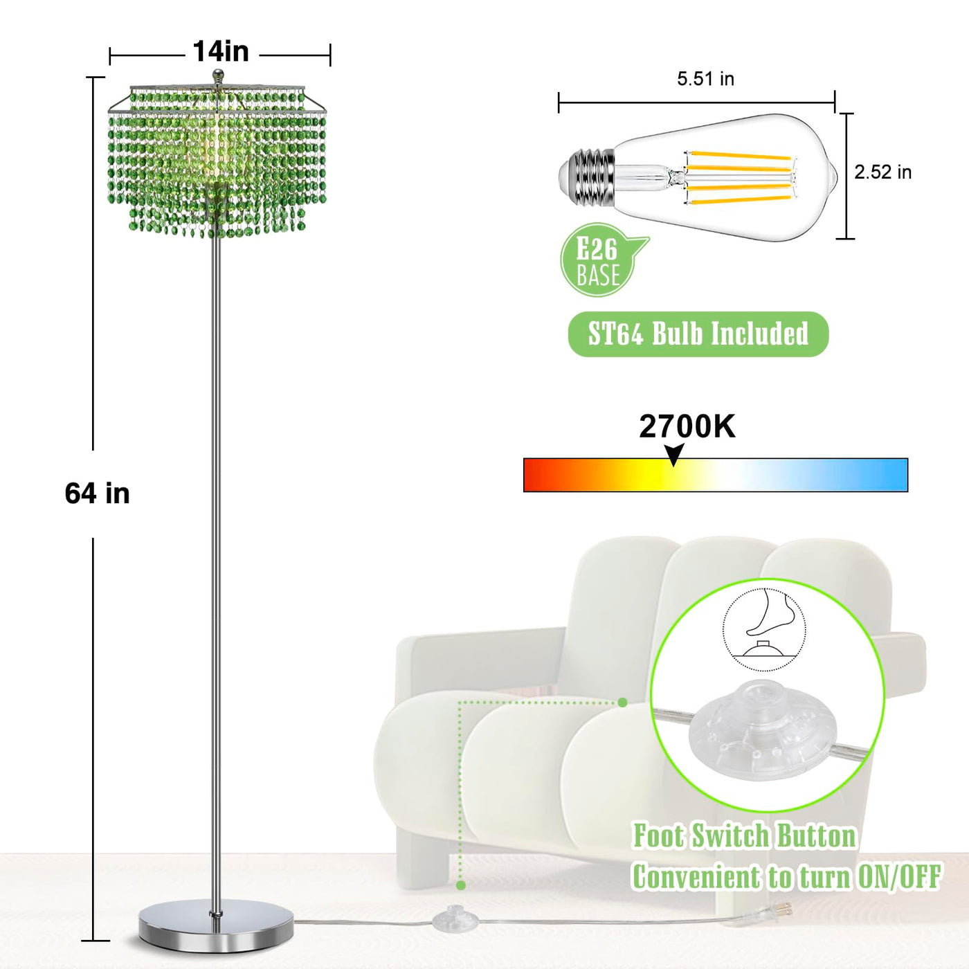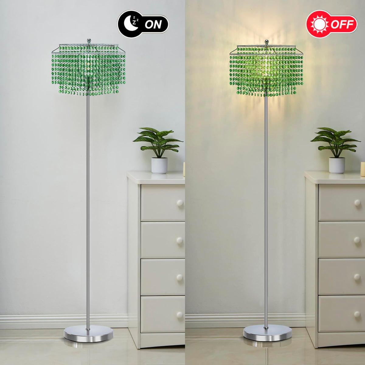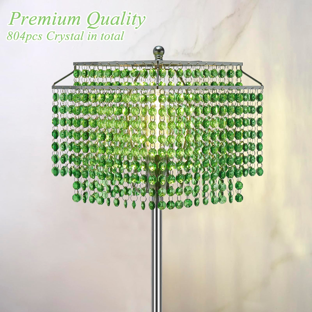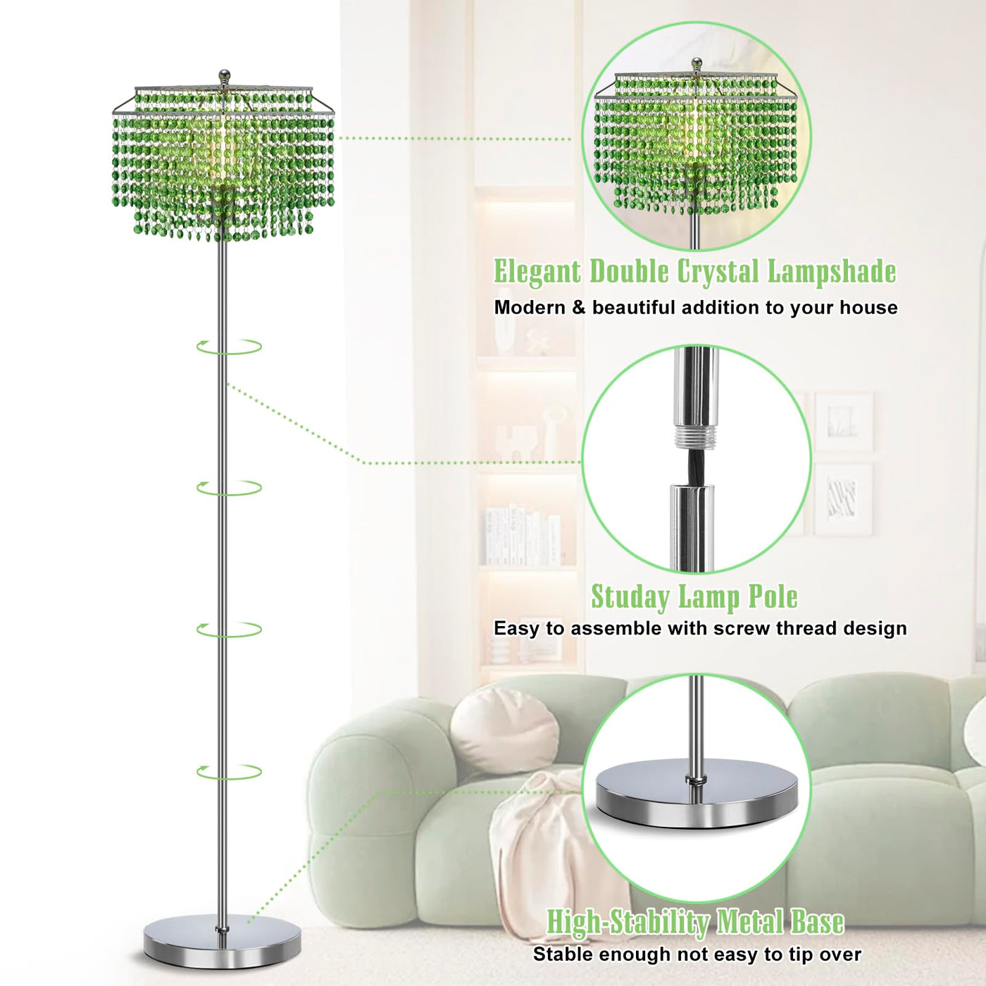 Crystal Floor Lamp, 64'' Tall Elegant Standing Lamp With On-Off Foot Switch, Silver Lamp With Green Double-Layer Crystal Lampsha