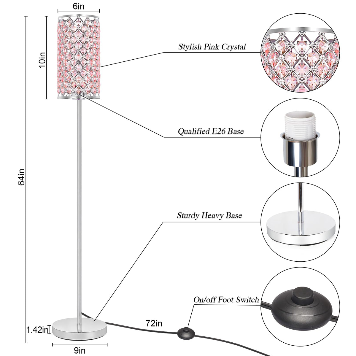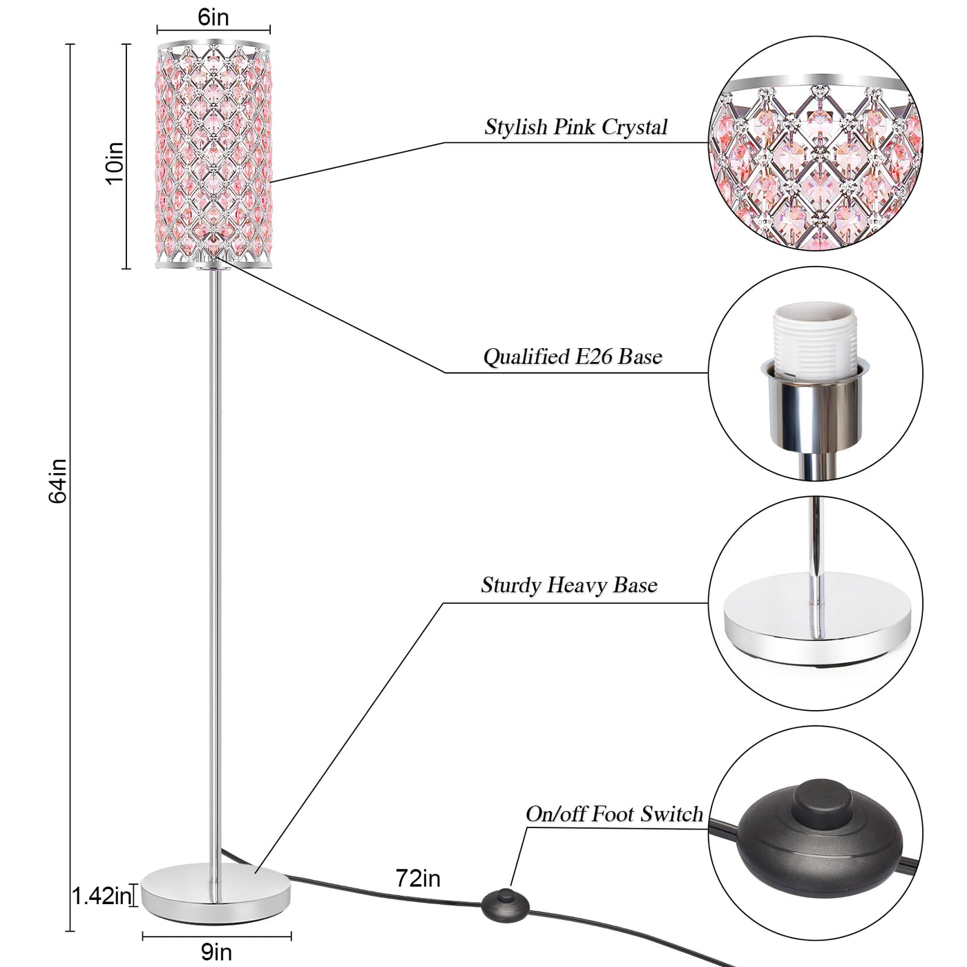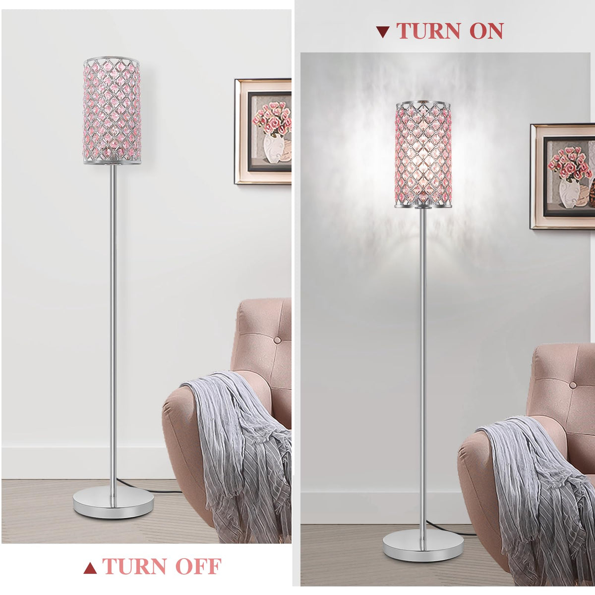 Crystal Floor Lamp For Bedroom, Silver Floor Lamp With Pink Shade, Girls Floor Lamp With On/Off Foot Switch, Elegant Standing Li