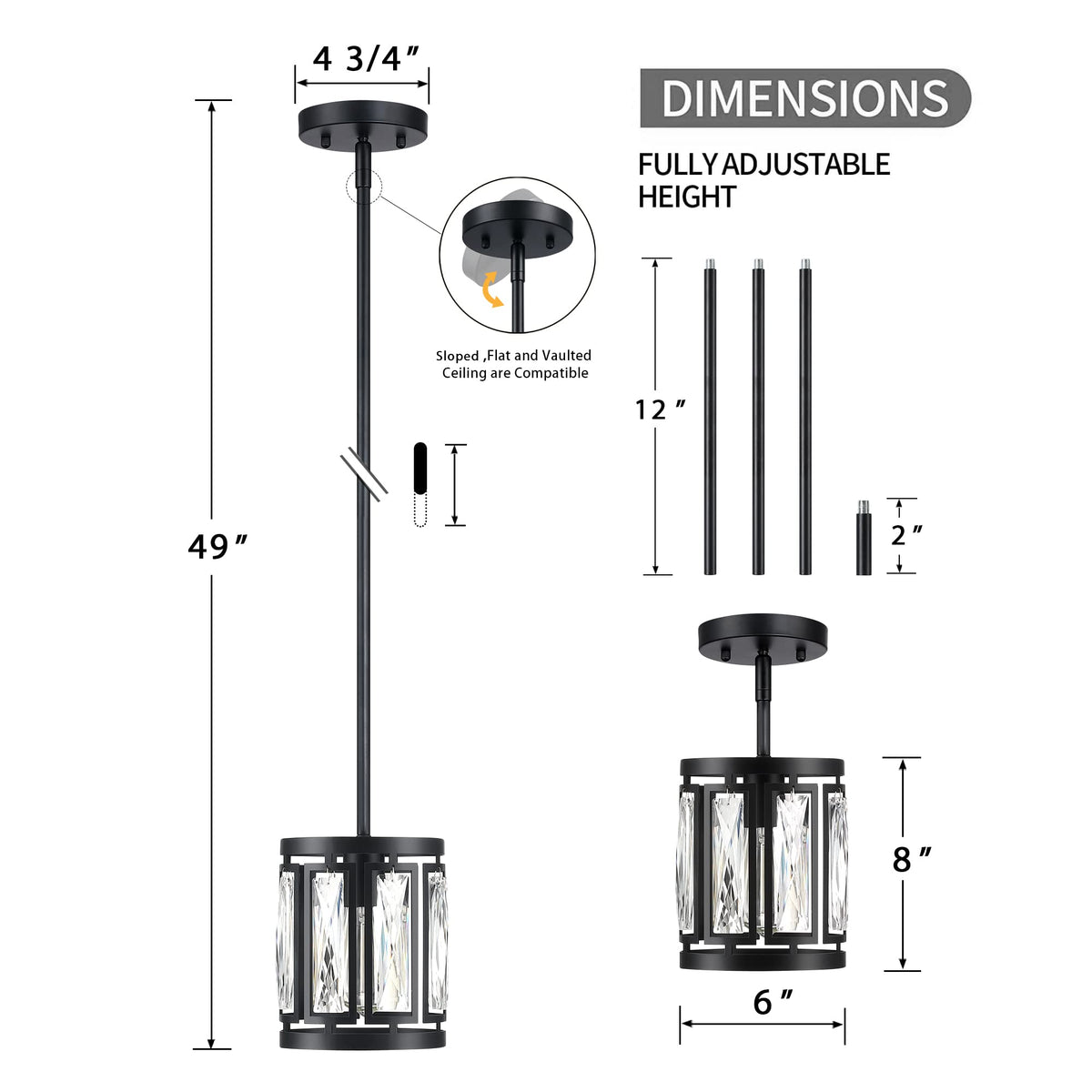 Q: What are the dimensions of the pendant lights?A: Each pendant light has an overall dimension of D 6 inches x H 12.75 inches to 49 inches, making it suitable for various indoor areas.