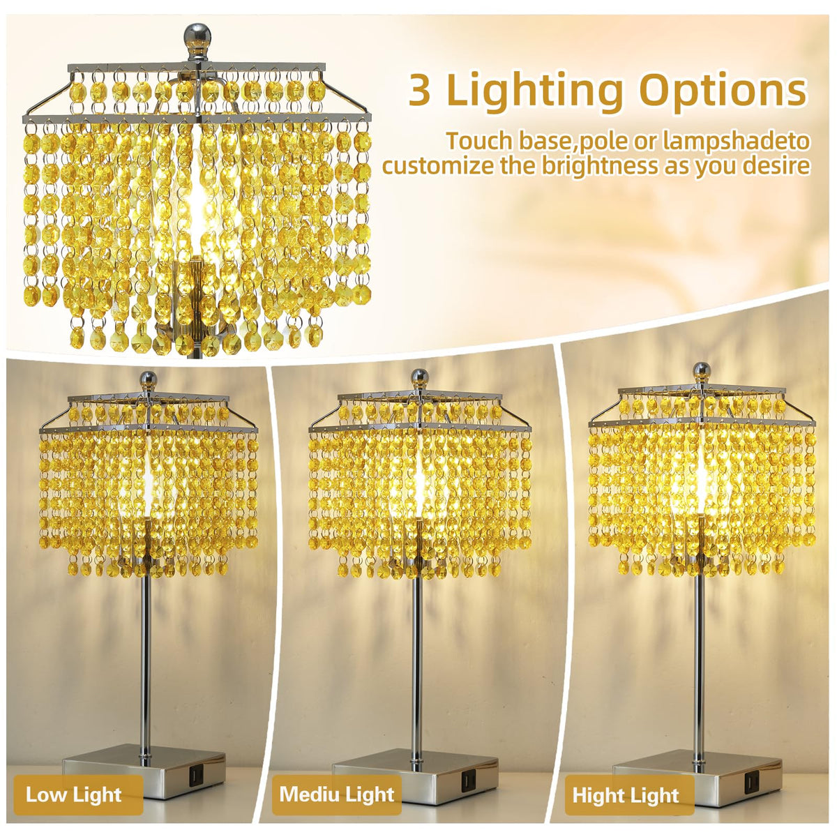 Q: What are the brightness levels of the Crystal Table Lamp?A: The Crystal Table Lamp features a 3-way dimmable design that allows you to choose from low, medium, and high brightness levels. You can easily adjust the brightness by tapping the top of the base, pole, or shade.