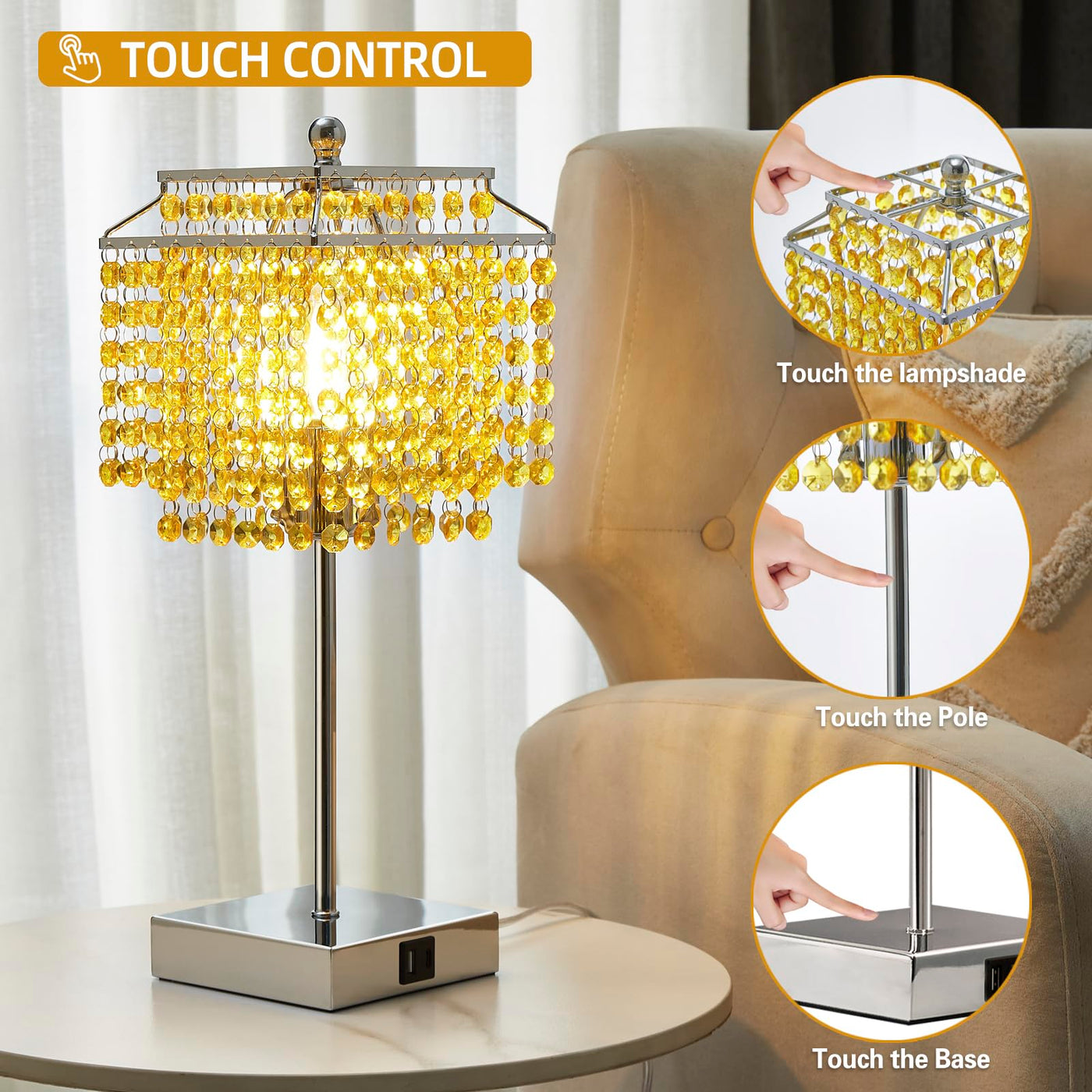 Crystal Table Lamp With Touch Control, Bedside Lamp With Usb C+A Ports, 3-Way Dimmable With Crystal Shade For Girls Bedroom, Liv