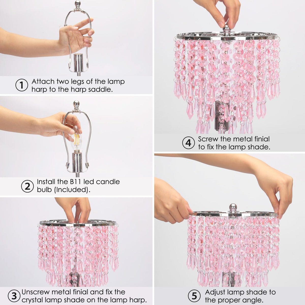 Q: How do I assemble the lamp?A: Assembling the lamp is simple and quick. The crystal strands are already attached to the lampshade, allowing you to complete the installation in about 2 minutes without any tools.
