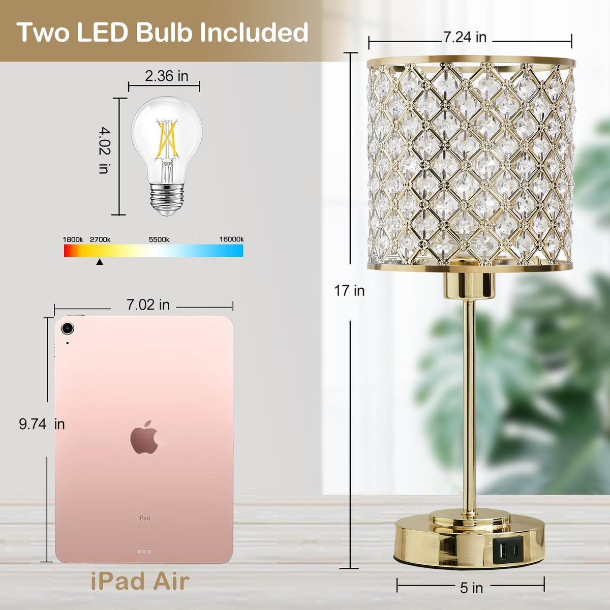Q: What are the dimensions of the Crystal Touch Control Table Lamp?A: The dimensions of the Crystal Touch Control Table Lamp are 7.24 inches in length and 7.24 inches in width, making it a compact and stylish addition to your bedside or living room.