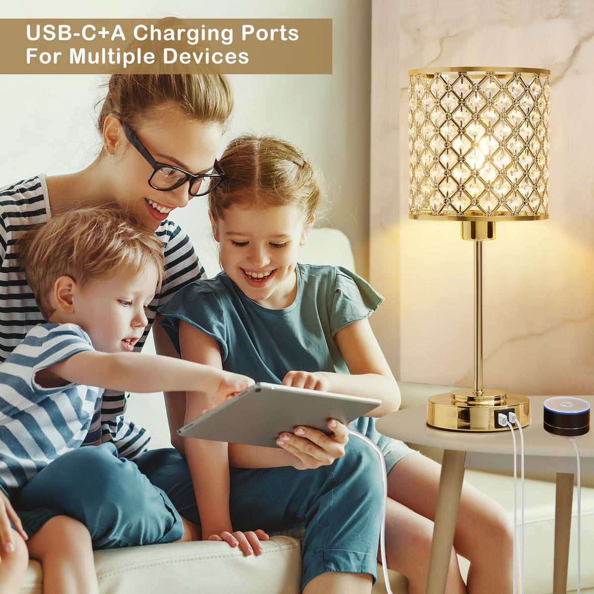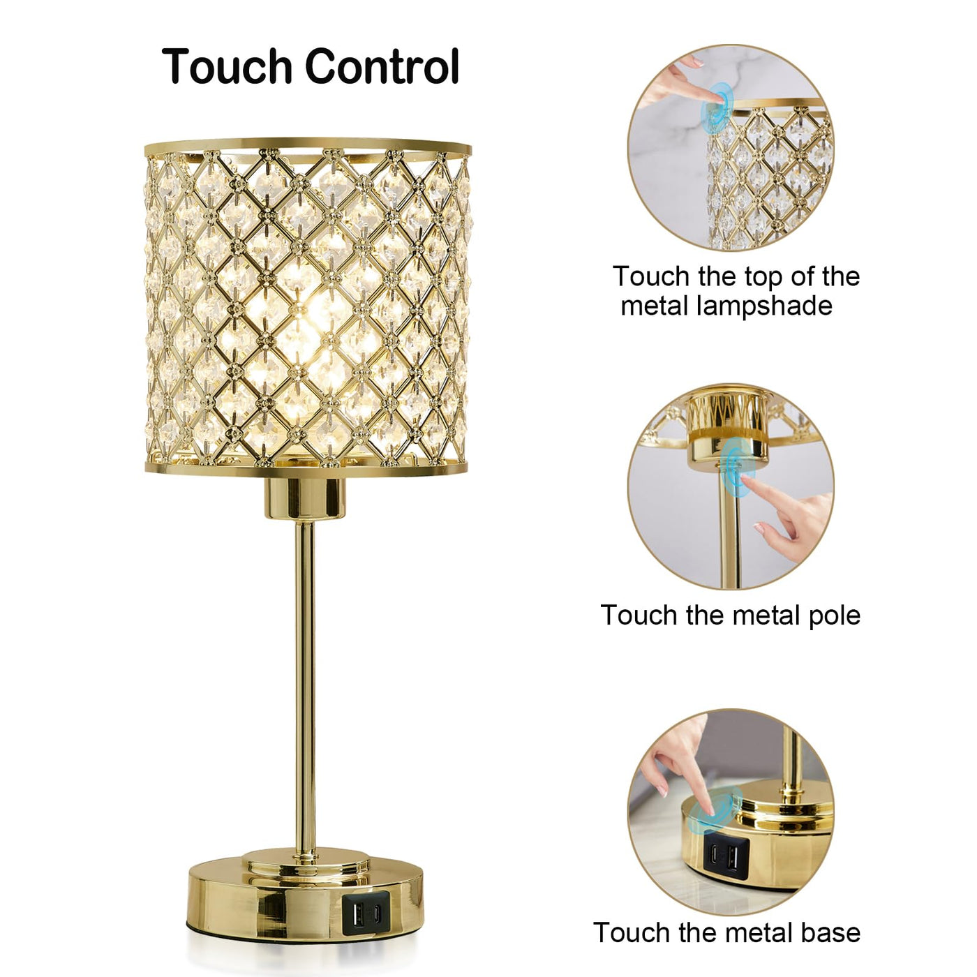 Q: What makes this lamp suitable for a girl's bedroom?A: The modern design and elegant gold finish, along with the sparkling crystal lampshade, make this lamp a perfect choice for a girl's bedroom, adding both style and functionality with its touch control and USB charging ports.