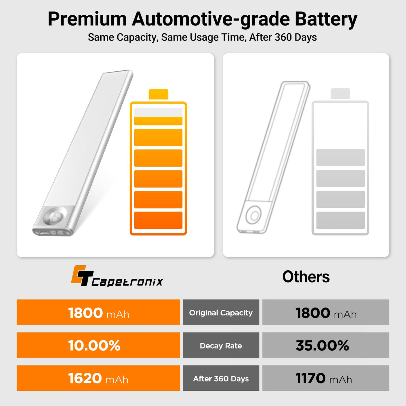 Q: How long does the rechargeable battery last on a single charge?A: The premium 1800mAh rechargeable battery in the CT CAPETRONIX Under Cabinet Lights can provide up to 60 days of illumination on a single charge, based on an average of 4 activations per day. This long-lasting power reduces the need for frequent recharging.