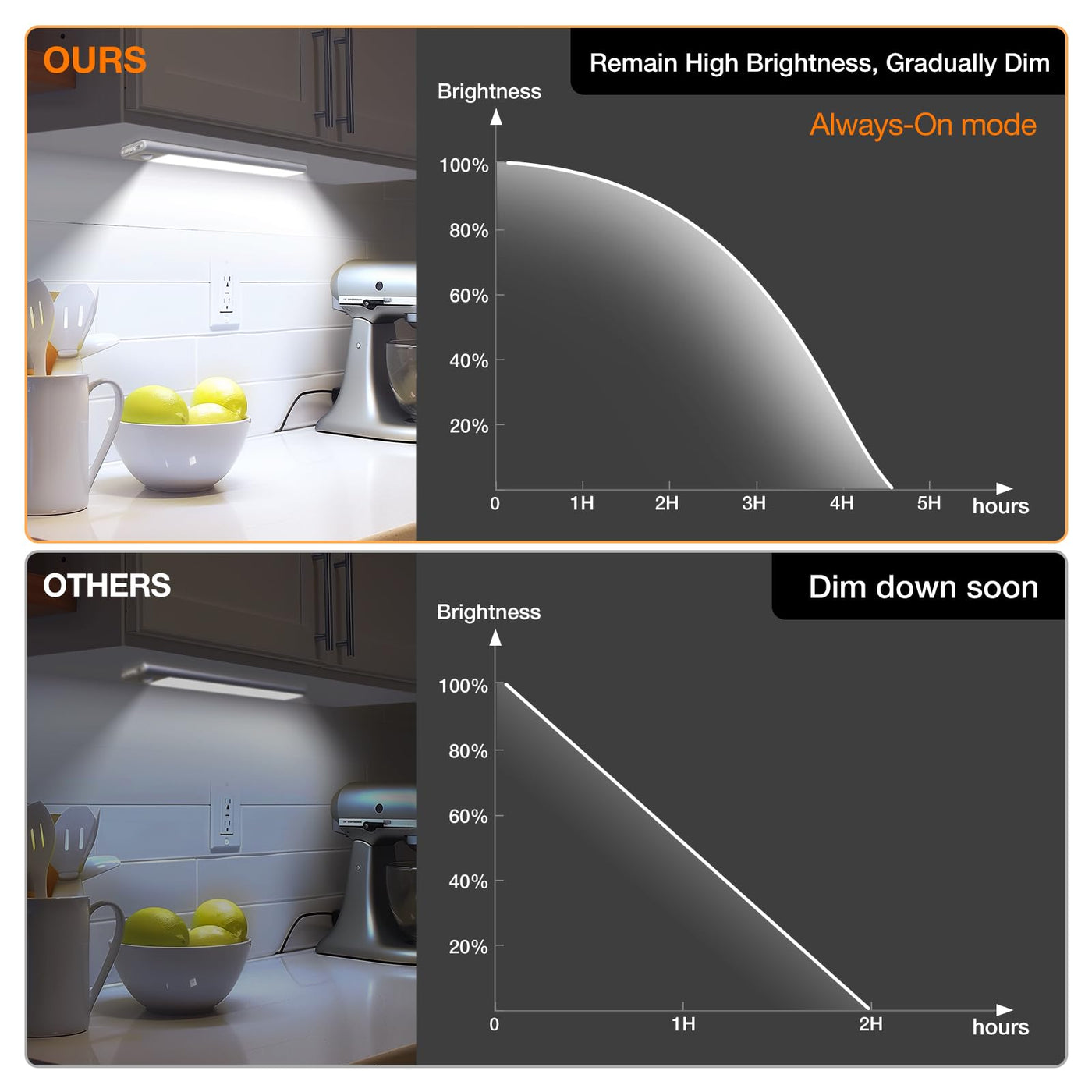 Q: What are the different lighting modes available on these cabinet lights?A: The CT CAPETRONIX Under Cabinet Lights feature three flexible lighting modes: night sensing mode for late-night use, all-day sensing mode for continuous illumination, and always-on mode for extended tasks. This versatility makes them suitable for diverse lighting needs.