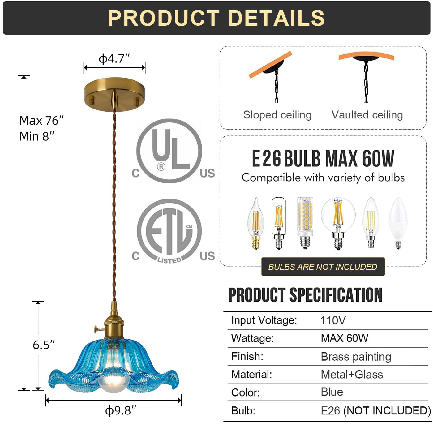 Q: What are the dimensions of the Curreyfols Blue Glass Pendant Light?A: The diameter of the glass pendant light is 9.8 inches, and the height can be adjusted from 76 inches to 8 inches, allowing for flexibility in installation according to your space requirements.