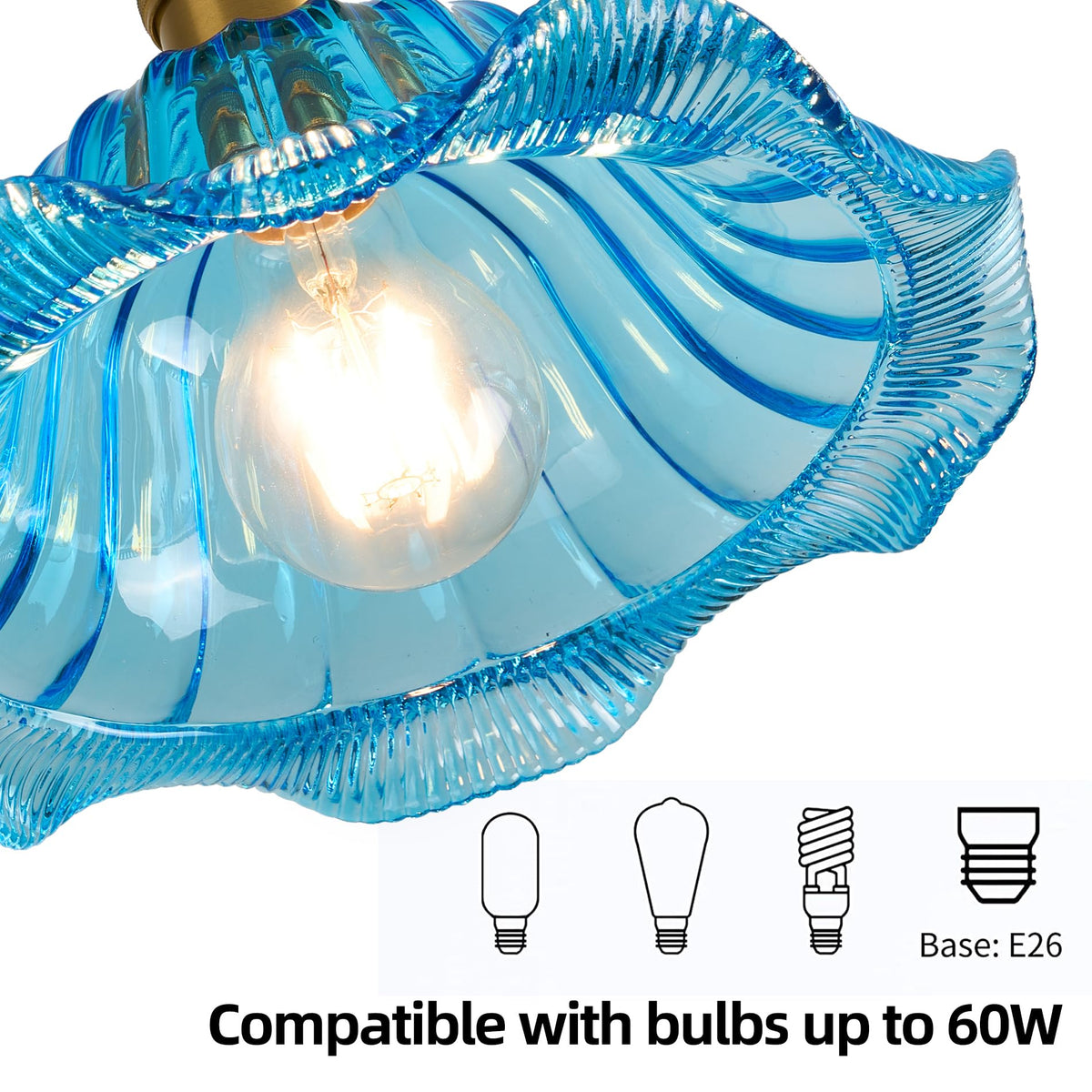 Q: What type of bulbs can I use with the Curreyfols Blue Glass Pendant Light?A: The Curreyfols Blue Glass Pendant Light supports any E26 screw bulbs not larger than 60W. Recommended options include filament bulbs, LED bulbs, incandescent bulbs, and halogen bulbs, with a 40W bulb being ideal for optimal performance.