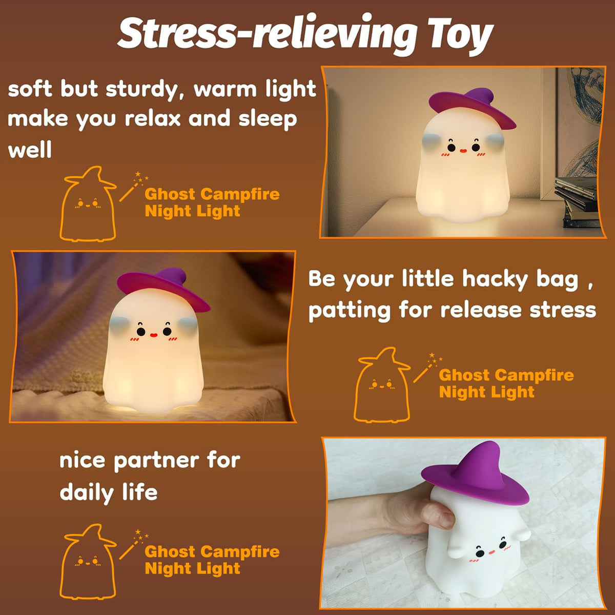 Q: What are the key features of the Cuxichuxinxi Nursery Night Light?A: The Cuxichuxinxi Nursery Night Light features a cute ghost design, made from soft silicone for safety, and offers 3 dimmable settings for customizable brightness. It is USB rechargeable, providing about 10 hours of use on a full charge, and is portable for easy placement throughout your home.