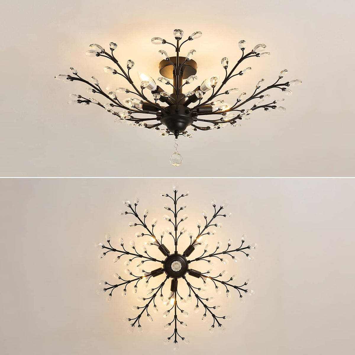 Q: What materials are used in this chandelier?A: This chandelier is made from metal and crystal. The combination provides both durability and an elegant aesthetic.