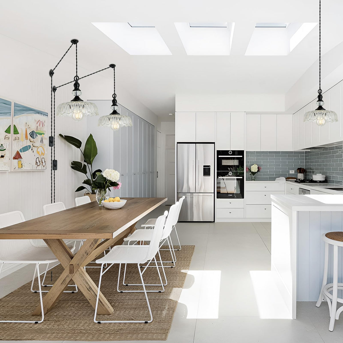 Q: What style does the CVKASH pendant light fixture complement?A: The CVKASH Plug in Glass Pendant Light Fixture features a vintage design that combines industrial elements with rustic chic and farmhouse style, making it a perfect fit for traditional and modern decor alike.