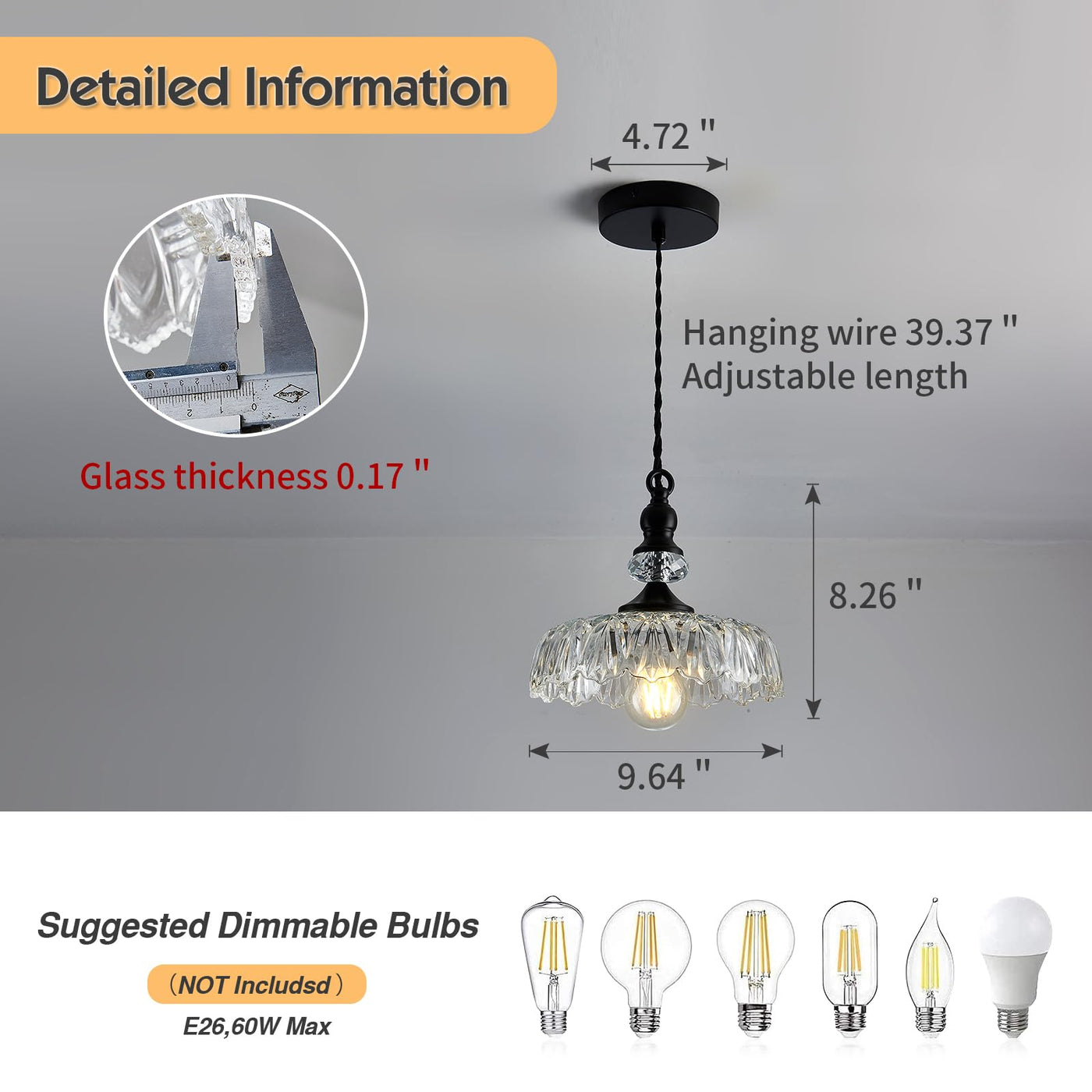Q: What are the dimensions of the CVKASH Vintage Glass Pendant Light Fixture?A: The CVKASH Vintage Glass Pendant Light Fixture has an item length of 9.65 inches and a width of 3.35 inches, making it a compact yet stylish addition to your home decor.