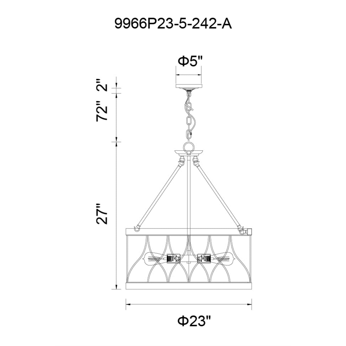 Q: What are the dimensions of the CWI Lighting Amazon 5 Light Chandelier?A: The dimensions of the CWI Lighting Amazon 5 Light Chandelier are H 27 inches, W 23 inches, and L 23 inches.