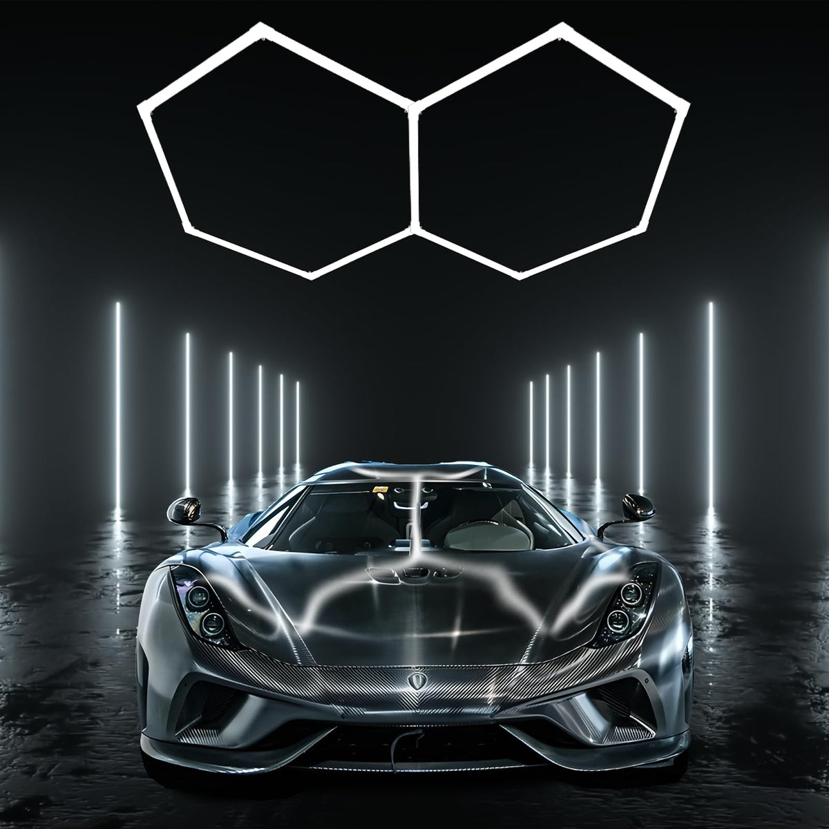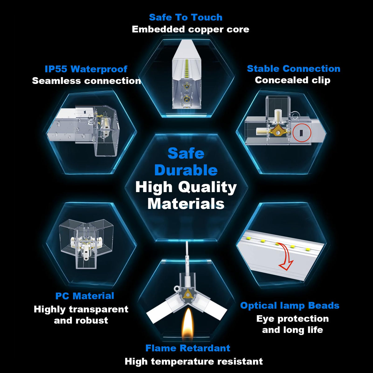 Q: What materials are used in the construction of these LED lights?A: The Hexagonal Garage Lights are designed with premium LED beads for higher brightness and a high-quality PC material for the transmissive layer, ensuring durability and lightweight performance.