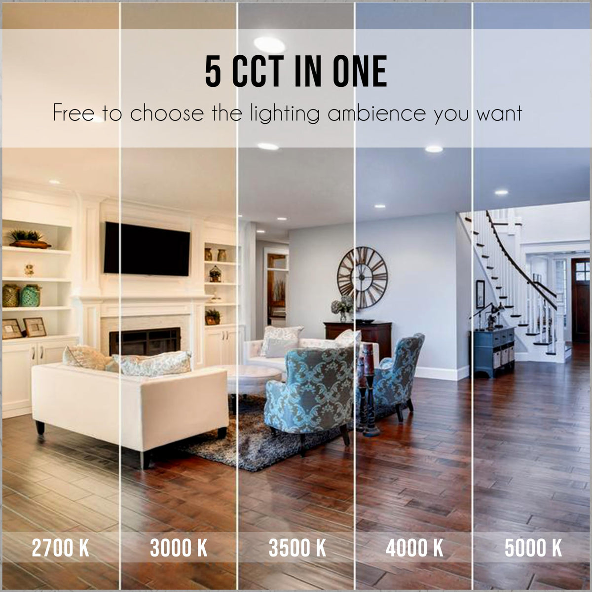 Q: Can I adjust the color temperature of this LED downlight?A: Yes, this downlight features adjustable 5CCT options, allowing you to choose from five different color temperatures: 2700K, 3000K, 3500K, 4000K, and 5000K for customized lighting.