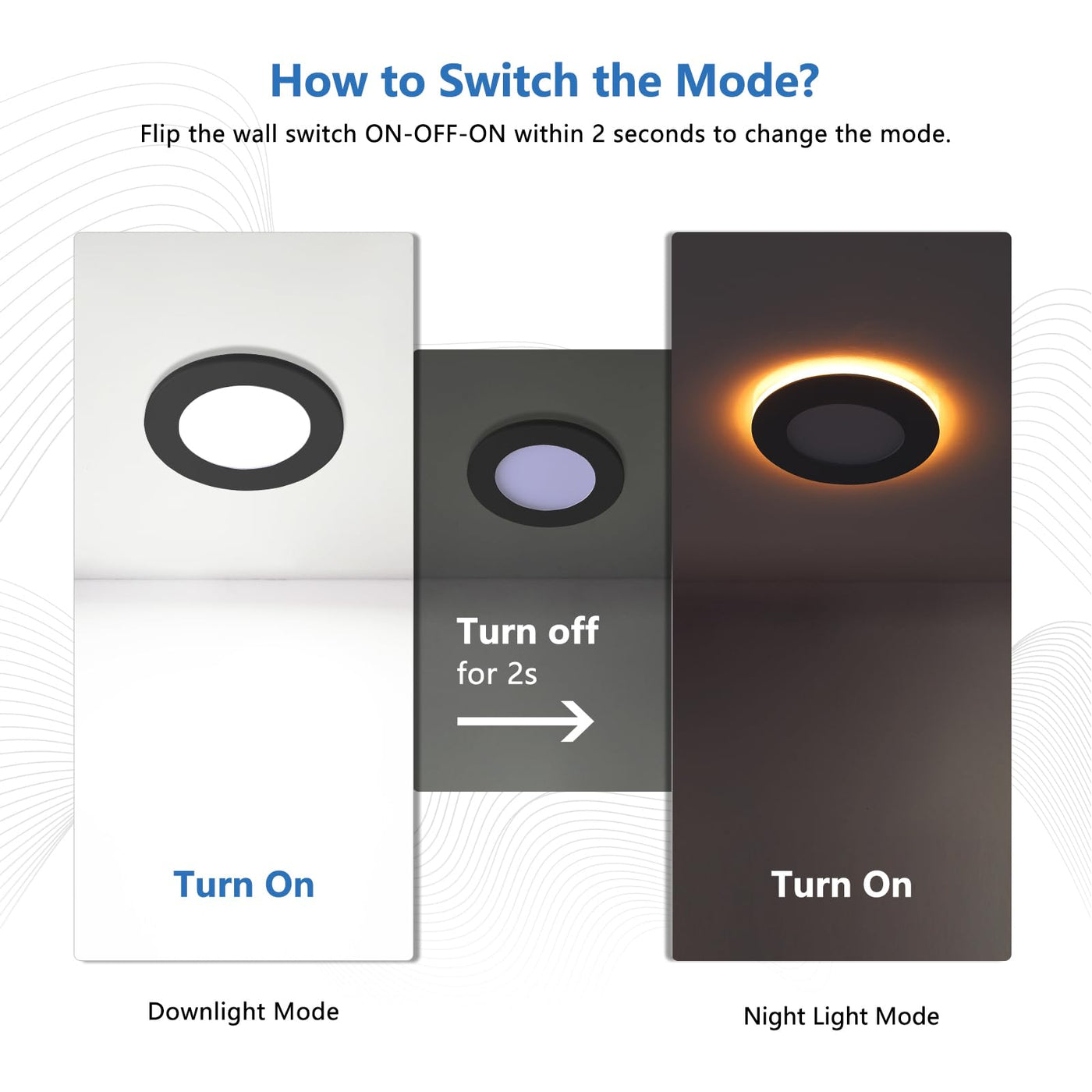 Q: What is the night light feature and how does it work?A: The recessed lights come with a night light mode that emits a soft 2000K amber light, providing gentle, glare-free illumination perfect for nighttime use.