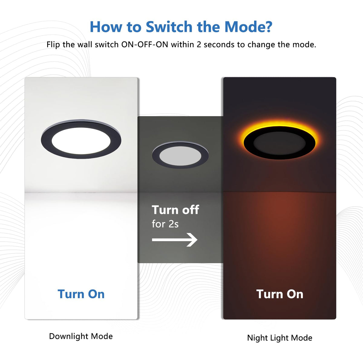 Q: How do I switch between the night light and downlight modes?A: To switch to night light mode, simply turn off the light and turn it back on within 2 seconds. For downlight mode, turn the light off for 8 seconds and then turn it back on.