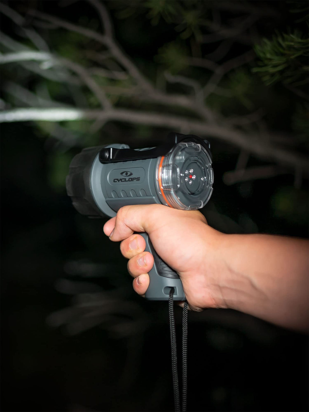 Q: What are the different modes available on the Cyclops spotlight?A: This spotlight features three working modes: High mode, Low mode, and SOS mode, enabling you to adjust the brightness based on your specific needs and environment.