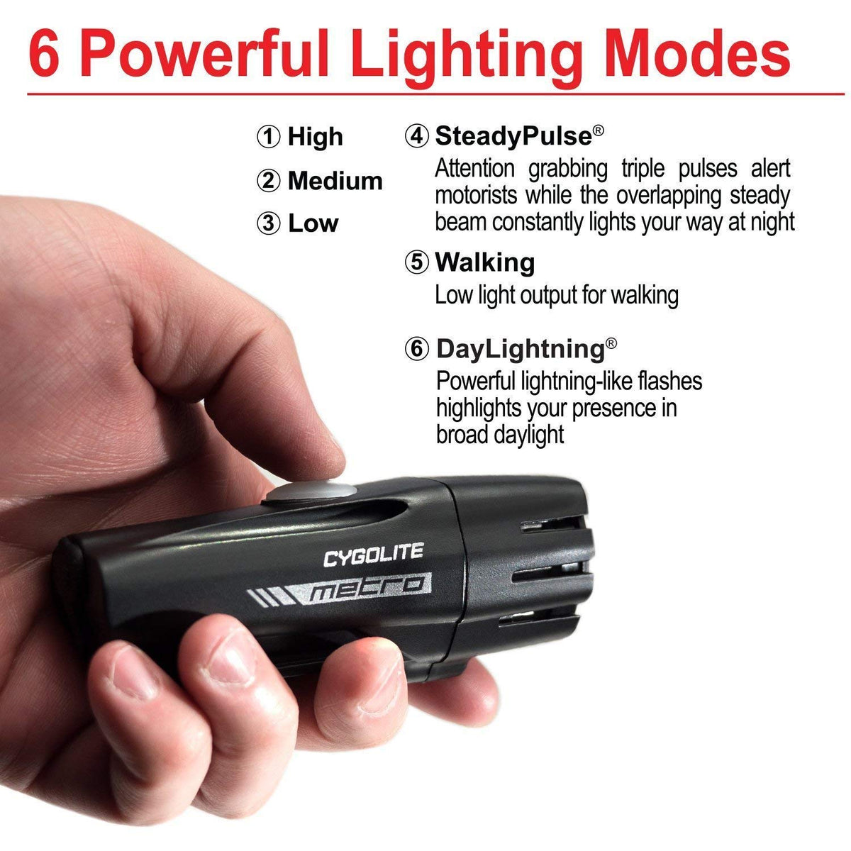 Q: What safety features does this bike light combo offer?A: This bike light combo features exclusive night and day modes, including SteadyPulse mode for nighttime visibility and DayLightning mode for enhanced presence during the day.