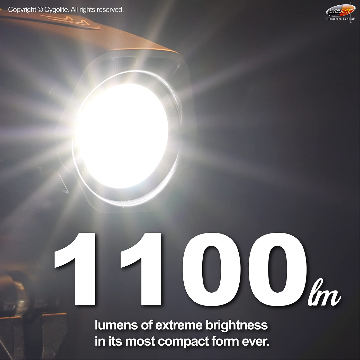 Meet the first bicycle headlight to break the thousand lumen barrier using a single LED and single cell. The Metro ProTM 1100 dominates the roads and beyond as the first of its kind to generate an incredible 1, 100 lumens in the most compact form to keep your handlebar clutter at a minimum while maximizing light output. Beyond its exceptional night capabilities, the Metro ProTM is equipped with daylight visible flash modes to make you stand out in broad daylight. Outshine the impossible with Cygolite and its new generation of American engineering and innovation. 1, 100 lumens of powerful brightness- Incredibly powerful 1, 100 lumens in the most compact and stylish form. - Its 1, 100 lumens throws a long range, extra wide beam to cover road and mountain biking. - Daytime visible flashes make you stand out on busy streets. See more at night and stand out in broad daylight- For night use, 5 steady brightness modes to best suit your riding conditions- For daytime, 3 different flash pattern modes to best suit your riding conditions- Walking mode can be used as a flashlight with an extra long run time Built for rugged conditions and convenient usage- Hard handlebar mount secures the light tightly for rough terrain- Light Activation Lock lets you disable the light for transport or storage- IP67 water resistant for use in all weather conditions- 1 to 100 hours of run time with 2: 30 hours USB fast charging- Low battery indicator alerts you with blinking power button when a charge is needed