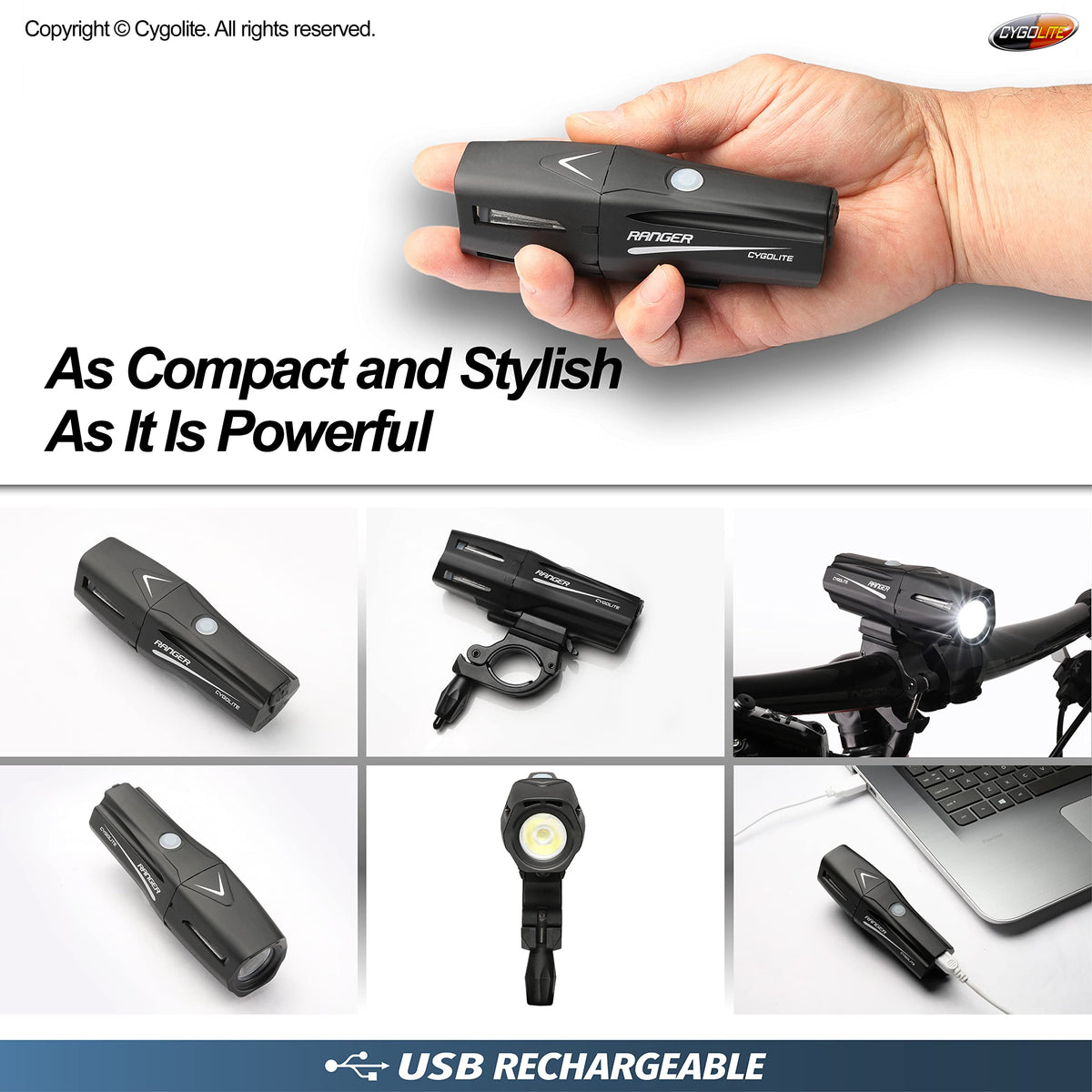 Introducing the 1400 lumen powerhouse. The all-new Cygolite Ranger 1400 is the brightest bike light ever launched in such an astonishingly sleek and compact design, thanks to its precision crafted ingenuity. At the push of a button, your path lights up with a dominating long range and extra wide beam that truly maximizes your line of sight through the darkest of night. Beyond its exceptional night capabilities, powerful daytime visible flashes make you stand out in broad daylight on busy streets. This is American bicycle lighting innovation. 1, 400 lumens of powerful brightness - Extremely powerful 1, 400 lumens in the most compact and stylish form. - Its 1, 400 lumens throws a long range, extra wide beam to cover road and mountain biking. - Daytime visible flashes make you stand out on busy streets. Modes to see more at night and to stand out in broad daylight - 8 lighting modes for day and night use (Boost, High, Medium, Low, SteadyPulse , DayLightning , Triple Flash, Zoom), plus Walking mode. - SteadyPulse mode alerts motorists with attention grabbing pulses while its overlapping steady beam constantly lights your way at night. - DayLightning flash mode bursts lightning-like flashes to make you stand out in broad daylight on busy streets. Built for rugged conditions and convenient usage - Hard clamp handlebar mount with quick release secures the light in tough terrain. - Light Lock Mode lets you disable the light for transport or storage. - Durable, compact size, and weighs only 185 grams. - IP67 water resistant for use in all weather conditions. - USB rechargeable with 1: 15 to 30 hours of run time, and 3: 30 hours fast charging. - Light mode memory saves the mode you're in before the light is turned off. - Low battery indicator alerts you when a charge is needed.