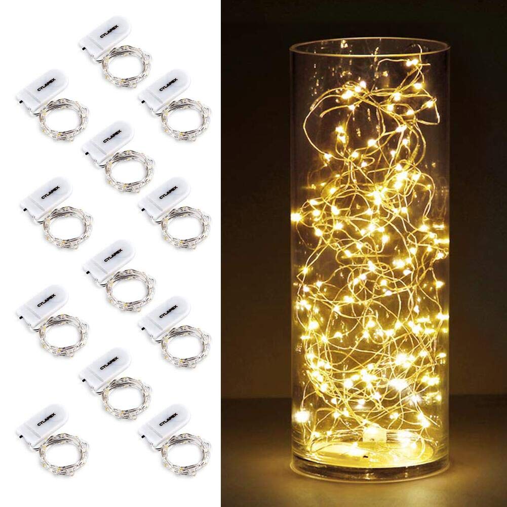 Pack of 12units(Left main image shows all 6 strands in the vase) NOTE: the battery of these short fairy lights last for 24hours around continuous life, batteries need to be replaced when the lights get dim | Flexible copper wire(silver coated): 3.3feet/1m extra thin string with bright high quality 20pcs micro LED starry lights(Color Temperature 2700-2900K Warm White), 7.87in/20cm cable between the battery box and the first LEDs | Easily Operated by batteries: 2 x CR2032 included, easy to be replaced, small battery pack is with on/off switch, so easy to operate and hide, 21hours continuous battery life and longer if using with breaks | Widely used: Flexible and thin but sturdily built, the string lights can be easily bended, 360 degrees sparkle with beautiful effect, perfect to decorate party, wedding, Christmas, shop, restaurant and room, anywhere indoor or outdoor usage of lighting decorations | What you get: Pack of 12 units of CYLAPEX LED starry string lights, Screw Driver. LED lights can last 50,000hours under regular using, it's waterproof string lights(except the battery pack)