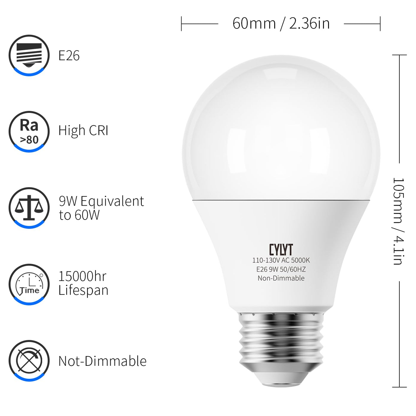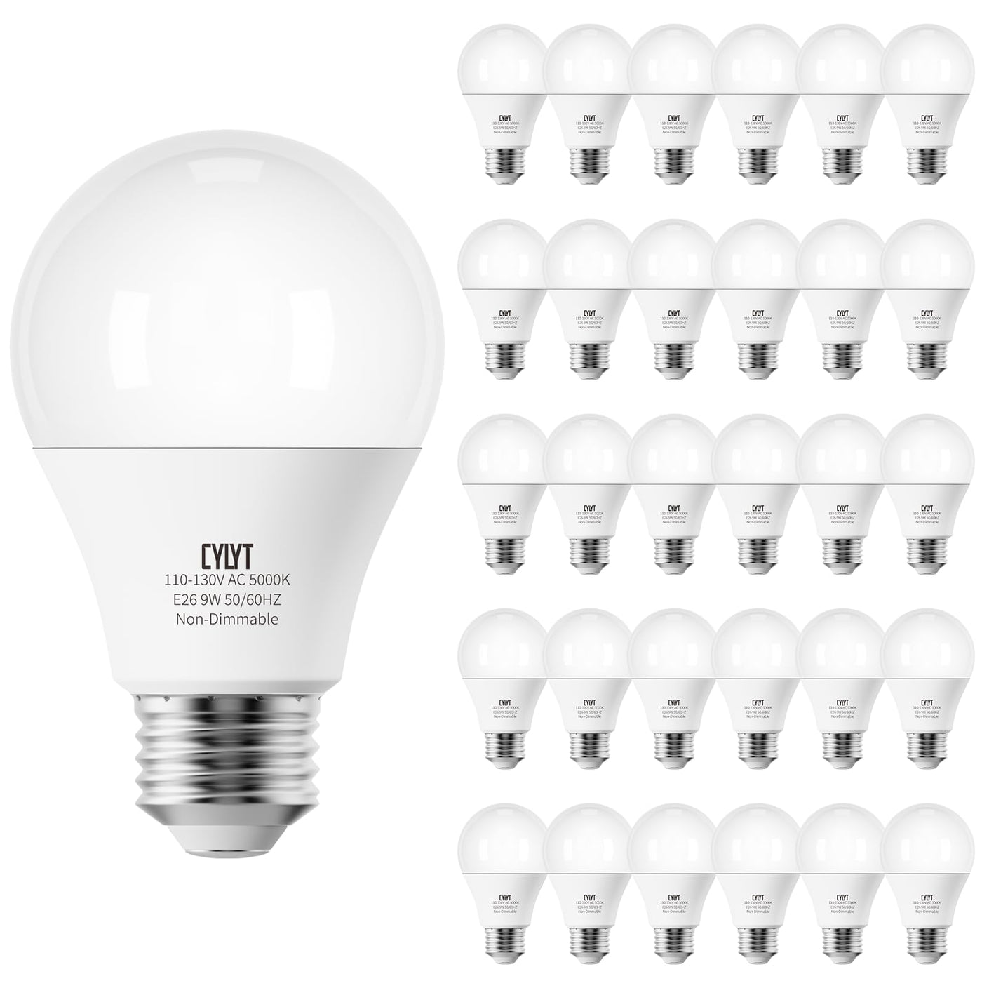 Cylyt Light Bulbs 60 Watt Equivalent Solt White 5000K, E26 A19 Led Light Bulb 9W 800 Lumen, Focos Led Para Casa, 120V 60Hz Lightbulbs For Indoor Outdoor, Non-Dimmable, 30-Pack