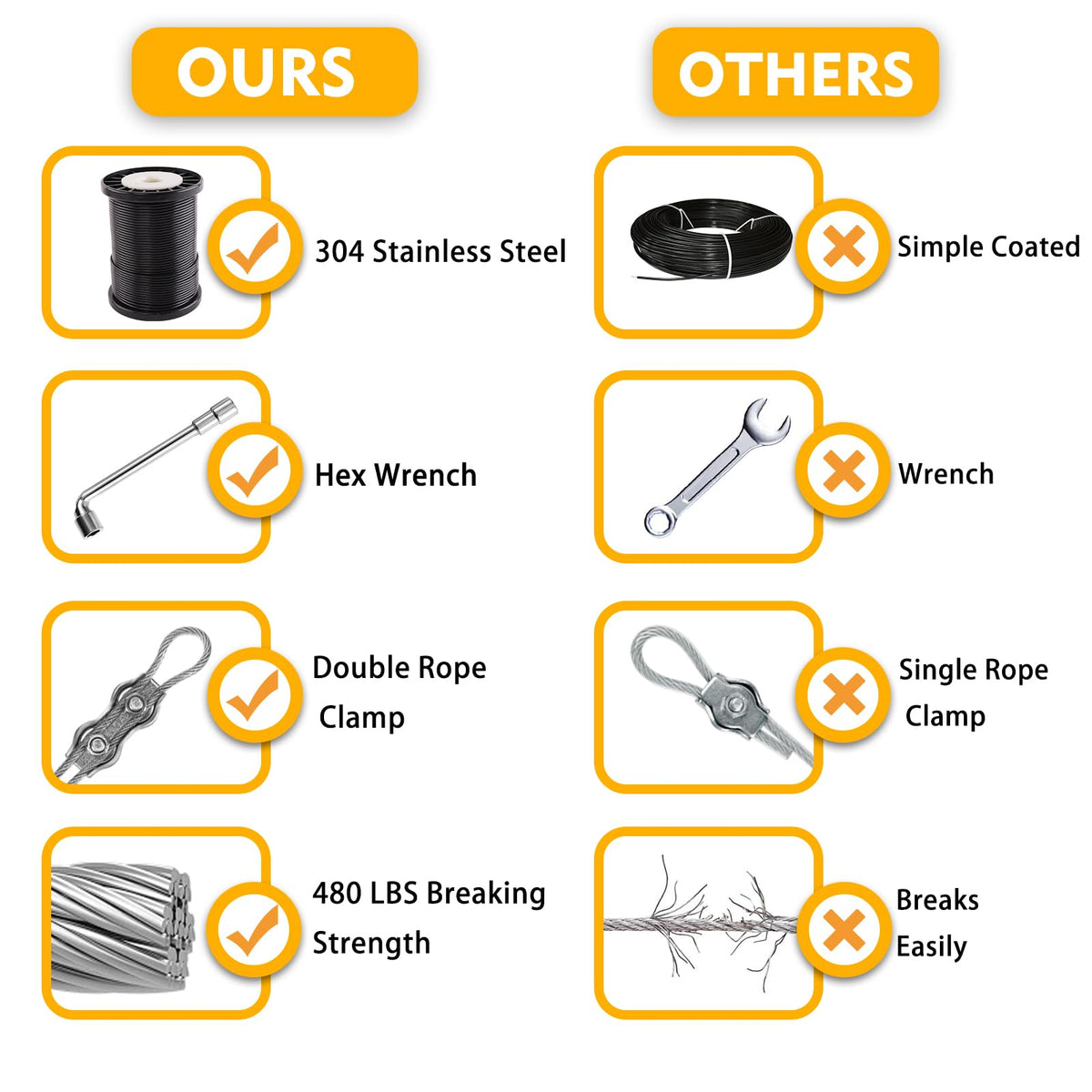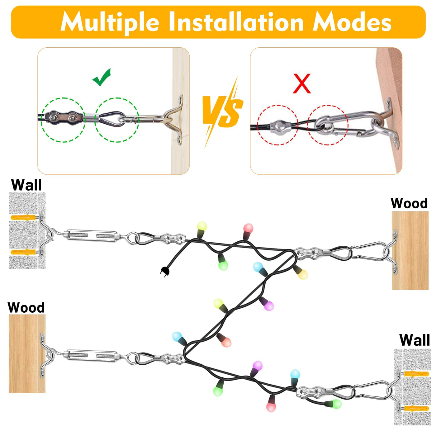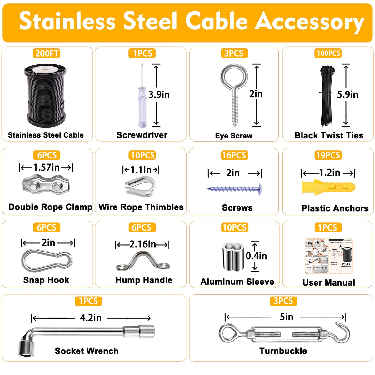 If you want to extend the lifespan of your string lights, this string light hanging kit is a must-have! It provides everything you need to hang outdoor lights. You can design different lighting configurations based on your yard layout to enhance the visual effect. 200ft stainless steel cable, 1 socket wrench, 3 turnbuckles, 6 snap hooks, 6 hump handles, 10 aluminum sleeves, 6 double rope clamps, 10 wire rope thimbles, 16 screws, 19 plastic anchors, 1 screwdriver, 3 eye screws, 100 black twist ties and 1 user manual. this outdoor string light hanging kit offers flexibility in use. Simply follow the instructions, secure the wires at both ends and adjust the cable tension by tightening the screw clamps. The cable of this string light hanging kit is made of black PVC-coated 304 stainless steel. With a breaking strength of 480 pounds, it is strong enough to securely support the string lights without breaking or sagging. This PVC-coated stainless steel cable is rust-resistant, insulated, weather-resistant, waterproof, corrosion-resistant, and highly durable, making it suitable for outdoor use in various harsh weather conditions such as intense sun exposure and heavy rain. The string light hanging kit is suitable for backyard cafe lights, garden lights, patio lights, party lights, curtains, clothing, and sun shades. Unleash your imagination, create ambiance, and enjoy the fun of DIY. Leave a lasting impression on your friends and neighbors during holidays, weddings, birthdays, Christmas, and Halloween.