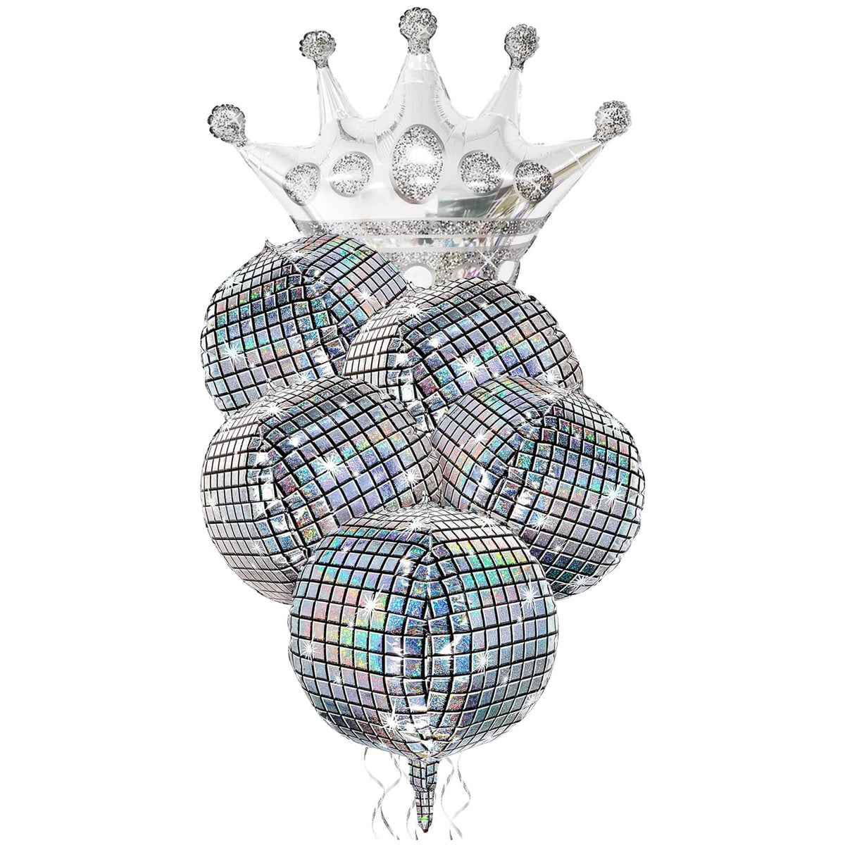 D Dywarm Holographic Mirror Disco Ball Set, 18-Inch, Glass Tiles, Silver Crown Balloon, Large, 006-Silver Disco