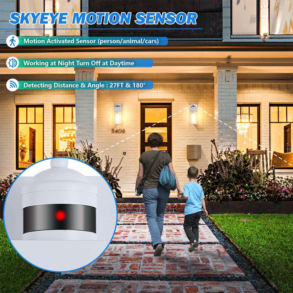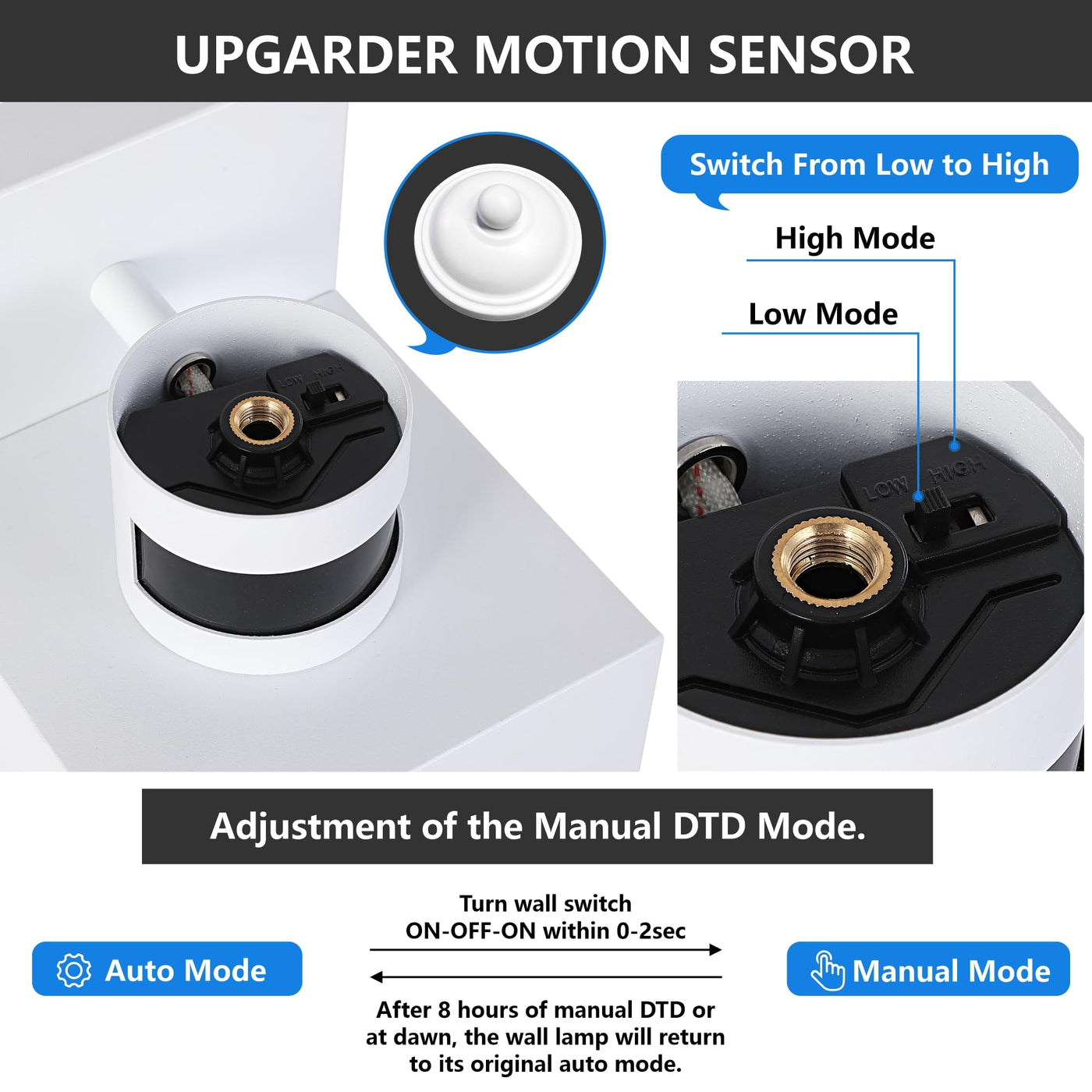 * **Advanced Motion Detection**: Equipped with an ultra-sensitive PIR motion sensor and a dusk-to-dawn feature, this light offers three adjustable lighting modes: Auto+Low, Auto+High, and Manual DTD, ensuring optimal energy efficiency and safety across various outdoor environments.