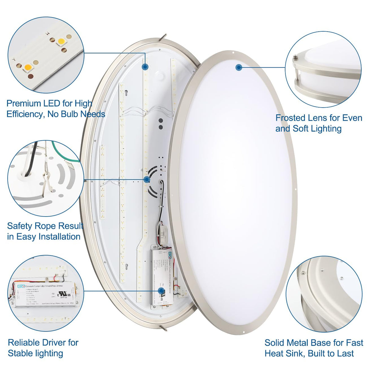 Introducing The Commercial Electric 32In. Oval Orbit Led Flush Mount With A Brushed Nickel Finish, Offering A Hassle-Free Modern Lighting Solution For Any Space In Your Home. Key Features: Modern Orbit Design Crafted From Stamped Steel With A Brushed Nickel Finish And Frosted Acrylic Lens. Choose Between Three Color Temperature Options: 3500K Soft White, 4000K Bright White, Or 5000K Daylight, Adjustable With An Integrated Switch Inside The Fixture. Produces 4000 Lumens Of Brightness While Consuming Only 50 Watts Of Energy, Replacing Outdated 125-Watt Incandescent Bulbs. Operates At 120 Volts And Suitable For Damp Locations, Providing Reliable Performance Even In Sub-Zero Temperatures Down To -4F. Maintenance-Free Design With No Bulbs To Replace, Offering A Rated Life Of Up To 50,000 Hours. Backed By A 3-Year Warranty For Peace Of Mind. Ideal For: Entryways, Kitchens, Pantries, Bedrooms, Bathrooms, Closets, Stairways, Family Rooms, Laundry Rooms, Offices/Dens, Or Basements.