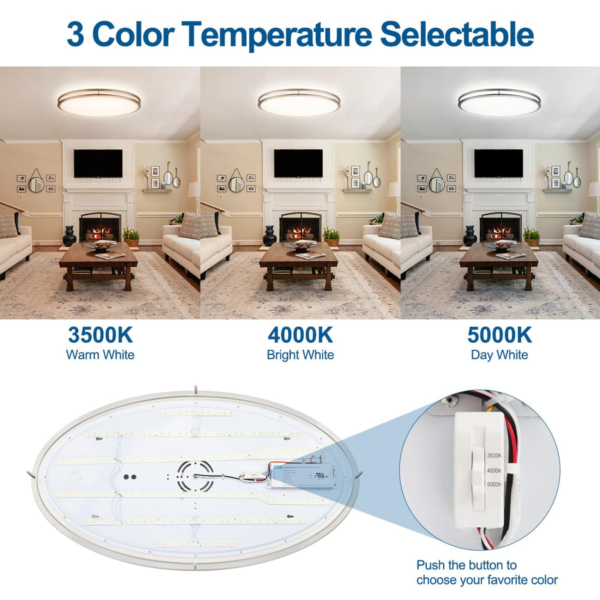 Q: What are the available color temperatures for the DAKASON 32In Oval LED Flush Mount Light?A: The DAKASON 32In Oval LED Flush Mount Light offers three selectable color temperatures: 3500K for Soft White, 4000K for Bright White, and 5000K for Daylight. This allows you to choose the ideal lighting to suit your preference and complement your decor.