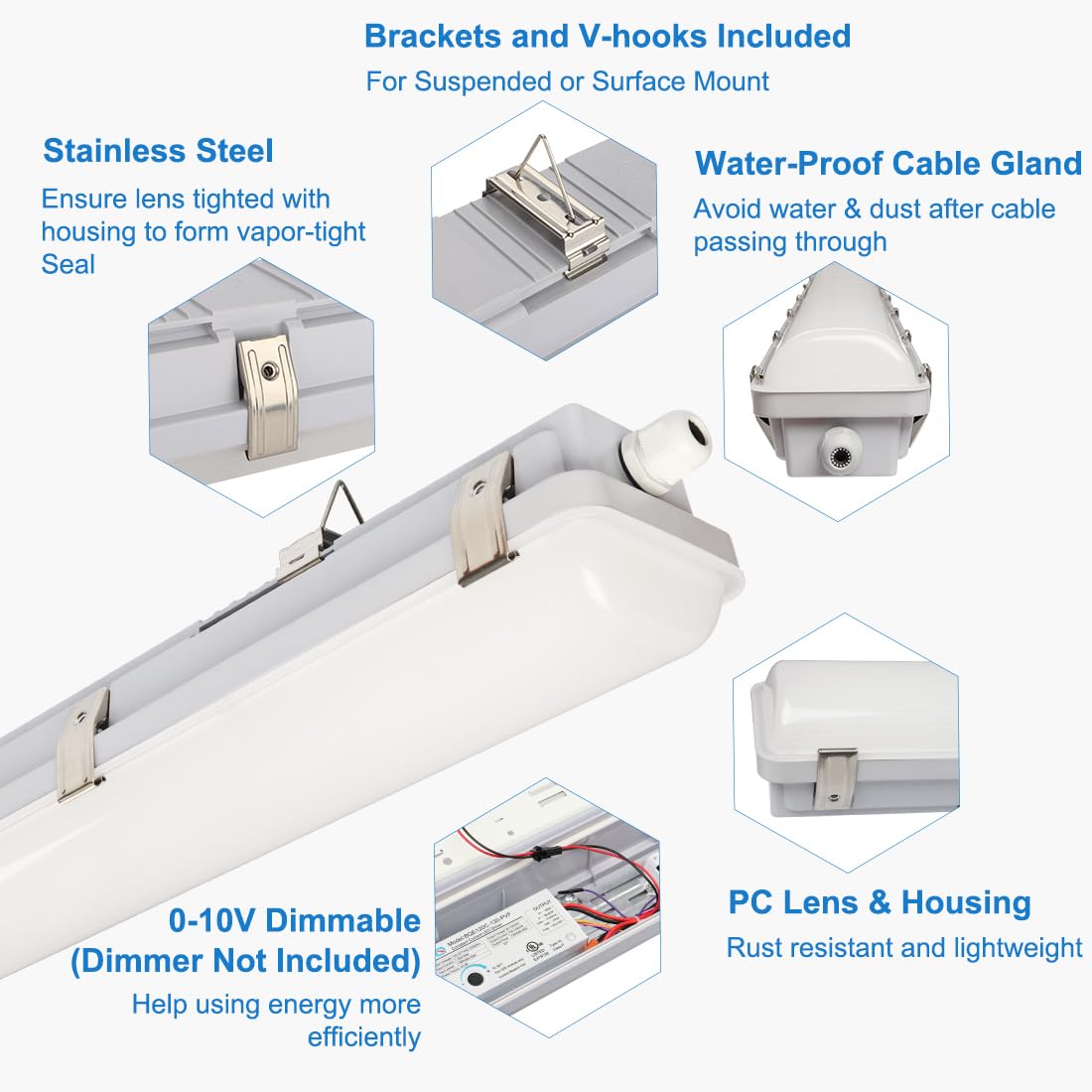 Q: Can I use a dimmer with the DAKASON LED Vapor Tight Light?A: Yes, the DAKASON LED Vapor Tight Light supports smooth dimming with a 0-10V low voltage dimmer, allowing for customizable brightness levels. Please note that the dimmer is not included with the product.