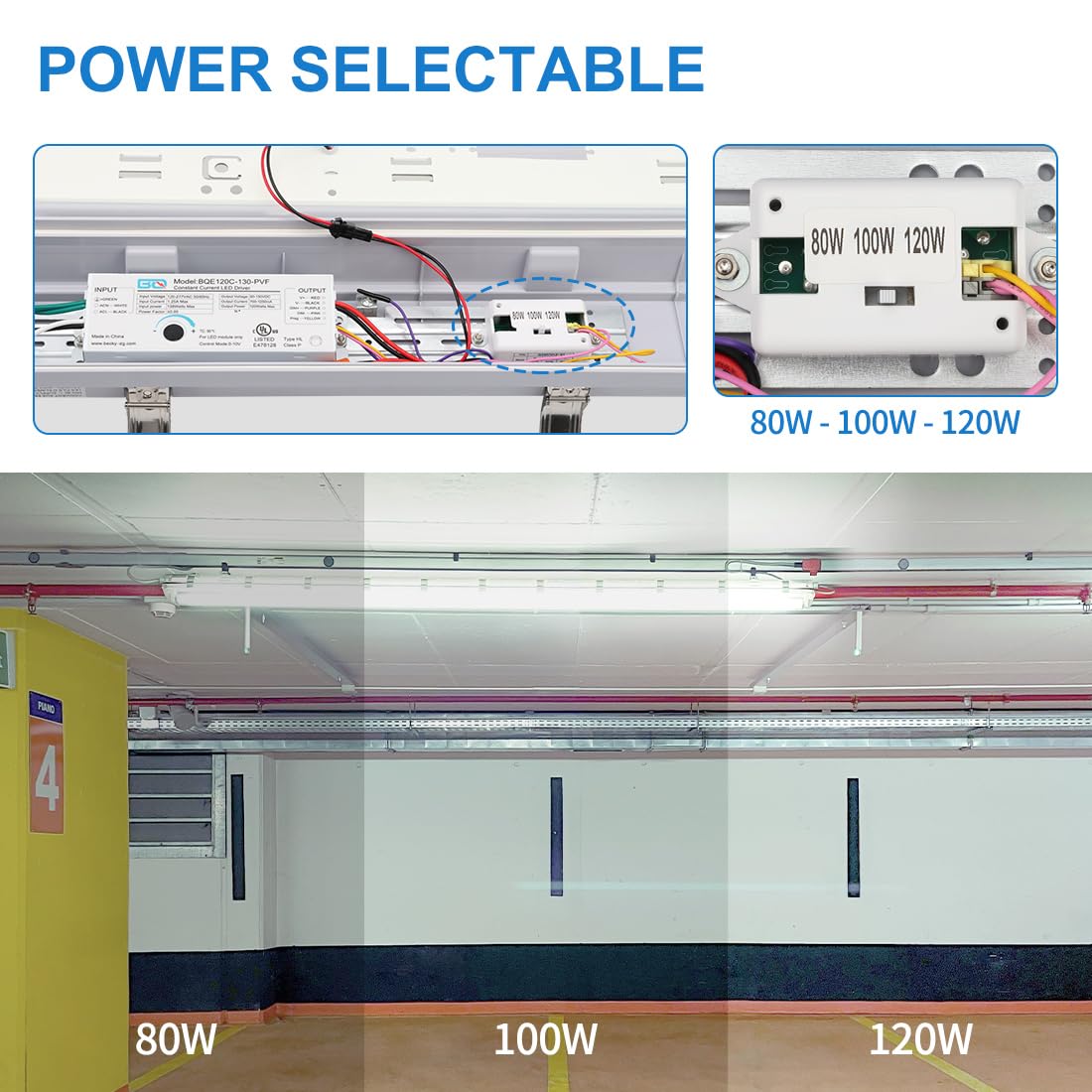Q: What are the power options available for the DAKASON 8FT LED Vapor Tight Light?A: The DAKASON 8FT LED Vapor Tight Light offers three selectable power options: 120W, 100W, and 80W. This allows users to easily adjust the brightness according to their specific needs before installation.