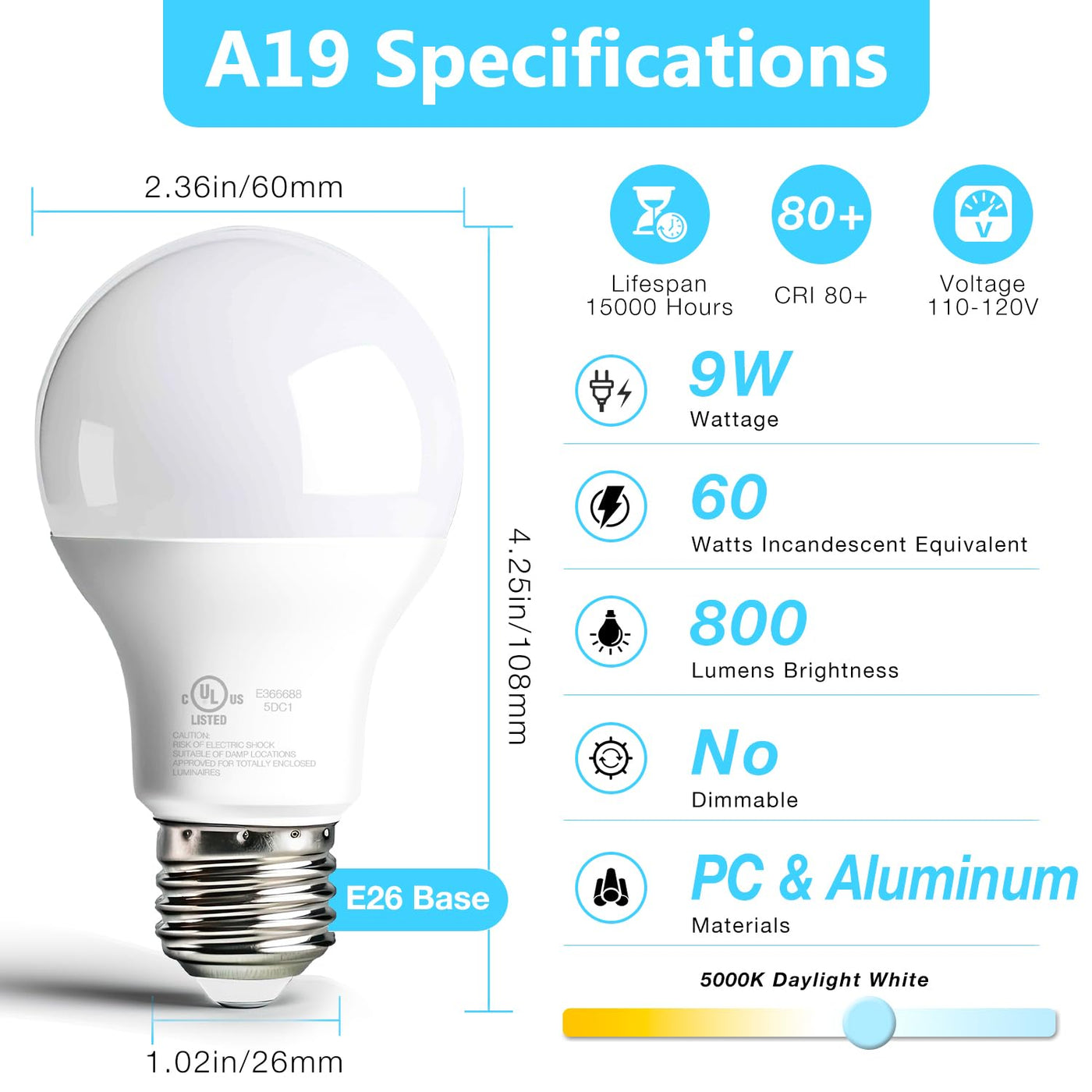 Dalattin 12 Pack A19 Led Bulbs, 9W Equivalent 60 Watts, E26 Base, 5000K Daylight White, 800 Lm, Efficient Energy Saving Lights For Living Room, Office, 80+ Cri, 120V, Ul Listed