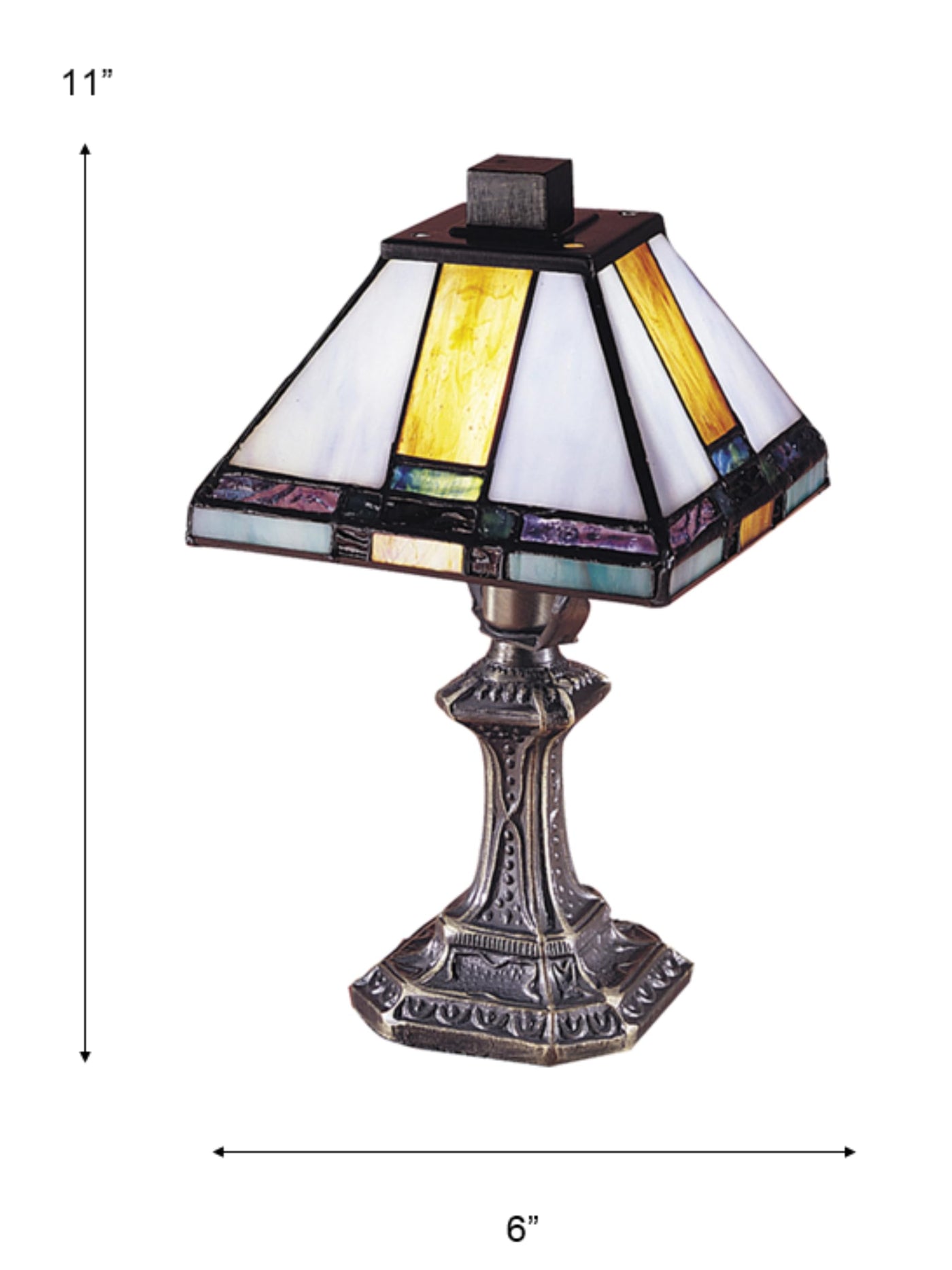 Q: What are the dimensions of the Dale Tiffany Tranquility Mission accent lamp?A: The Dale Tiffany Tranquility Mission accent lamp measures 6.00 inches in length and width, making it a compact addition to your home decor.