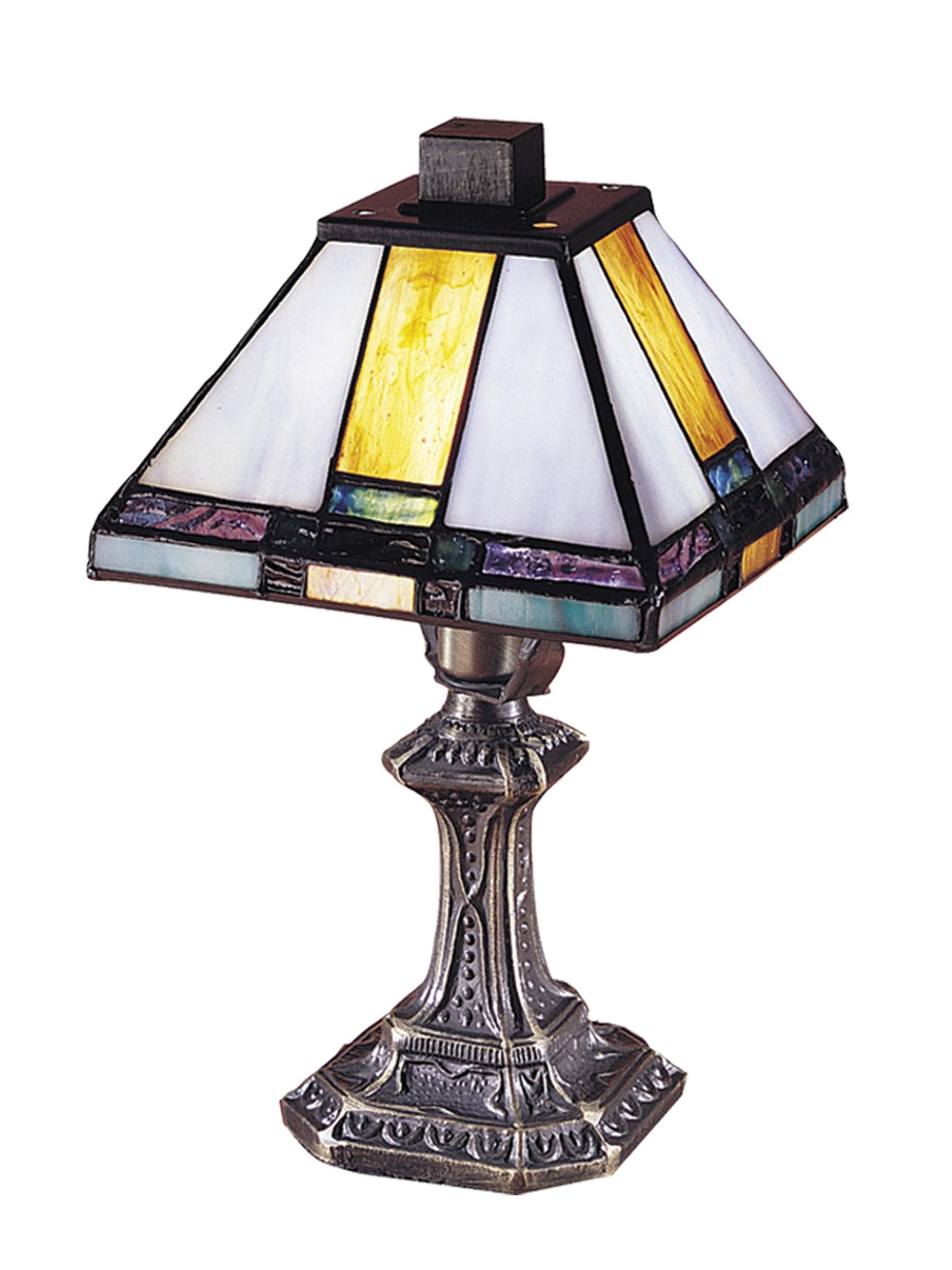 Add a splash of mission color and style anywhere in your home when you choose our Tranquility Mission accent lamp. The delicate square mission shade features a vertical panel of bright amber glass bordered on either side by 2 large triangular panels of crisp white. A band of dark amber runs around the lower edge of the shade. The shades bottom is a colorful row of blue and yellow rectangles with amber square inserts. The metal base is intricately carved with the meticulous attention to detail you have come to expect from Dale Tiffany. The Tranquility Mission accent lamp is the perfect accent to any decor that will quickly become a treasured keepsake.