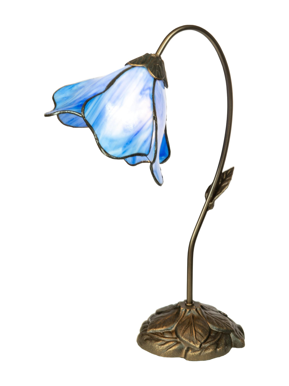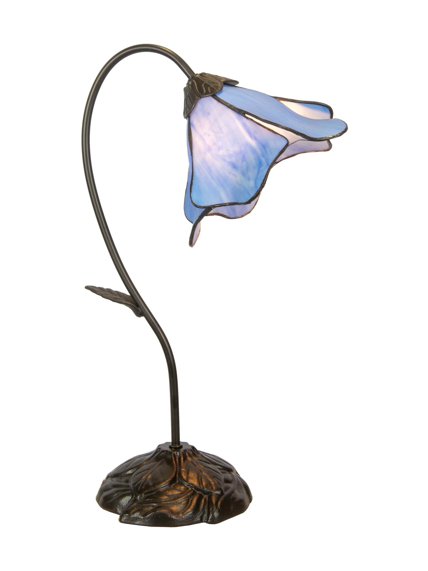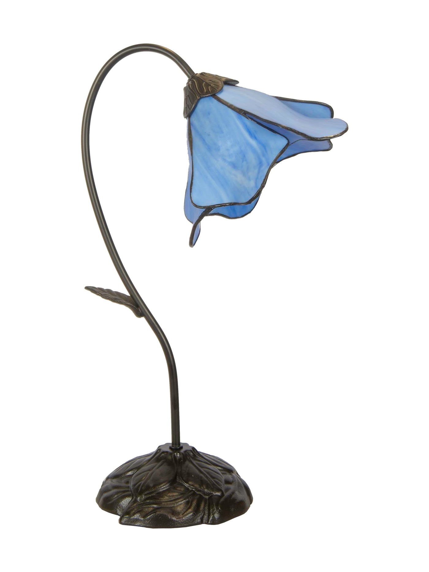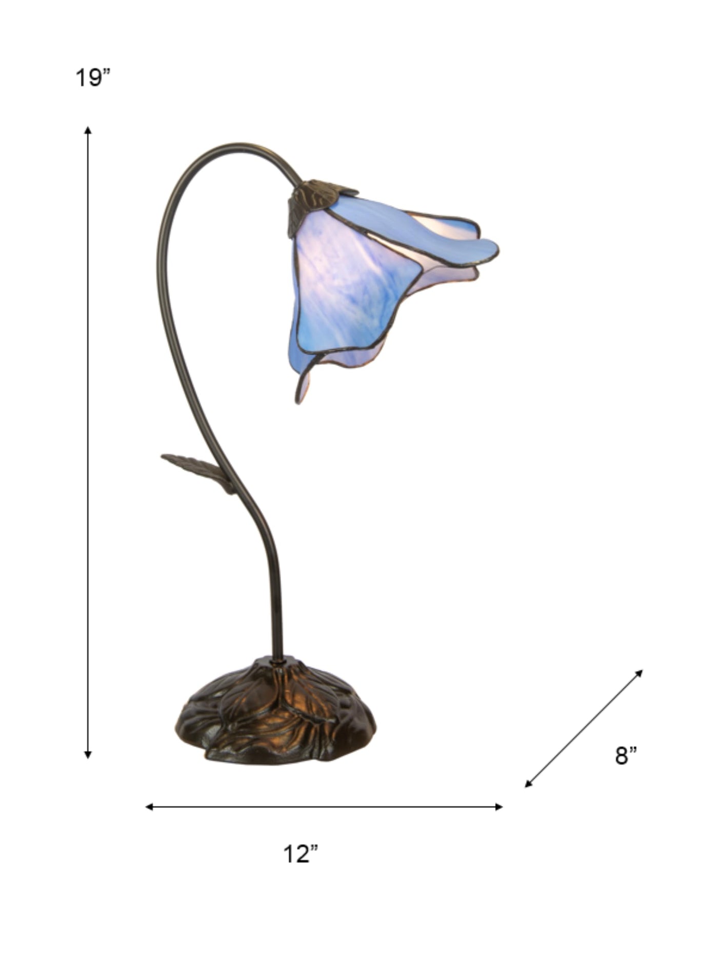 Q: What materials are used in the construction of the lamp?A: The lamp features a beautifully crafted metal base finished in dark antique bronze and a shade made of light blue art glass, showcasing intricate craftsmanship.