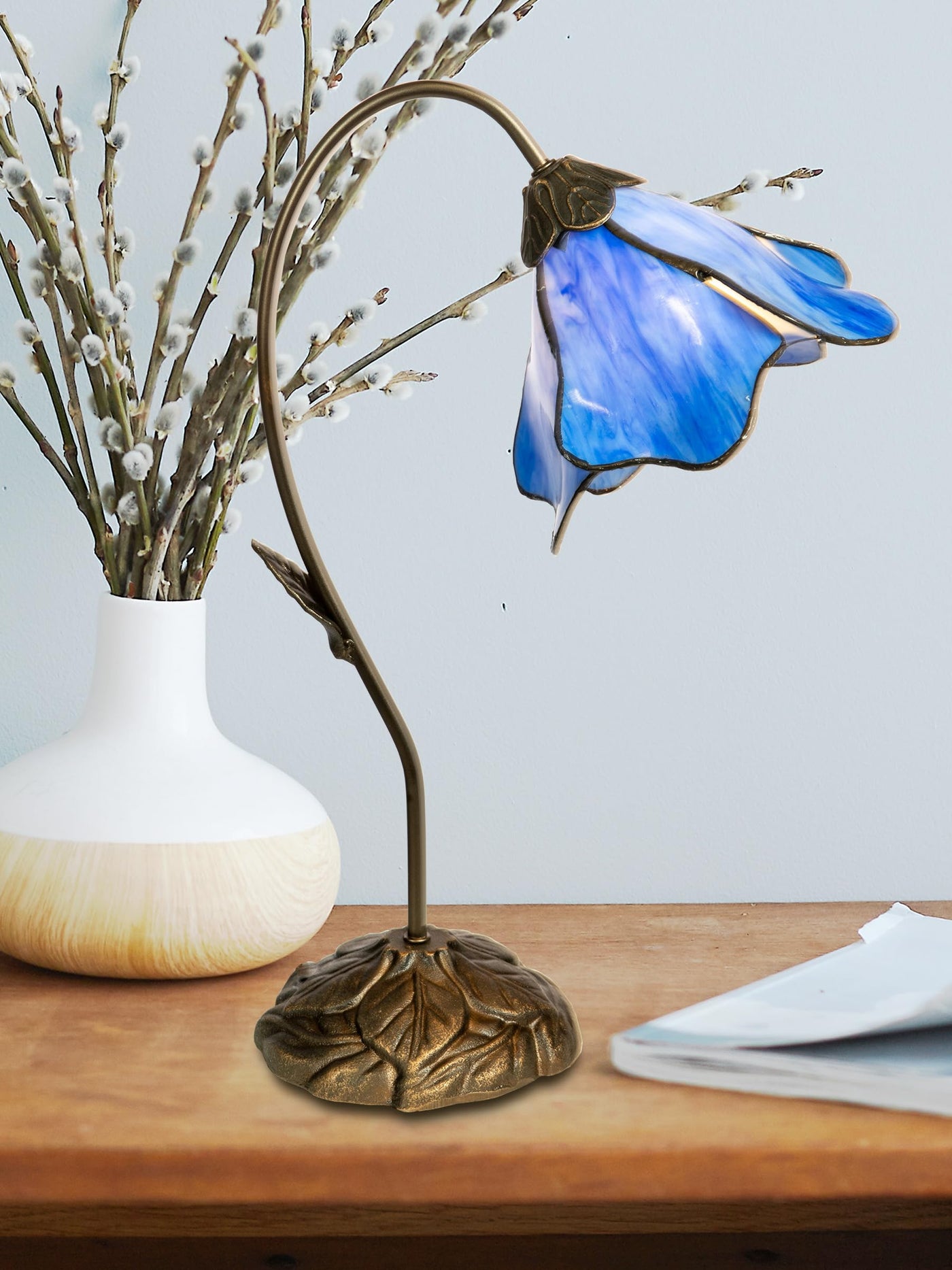 - **Elegant Design**: Features a single gossamer lily blossom crafted from light blue art glass, showcasing fluid and graceful edges that mimic the delicate structure of a real lily.