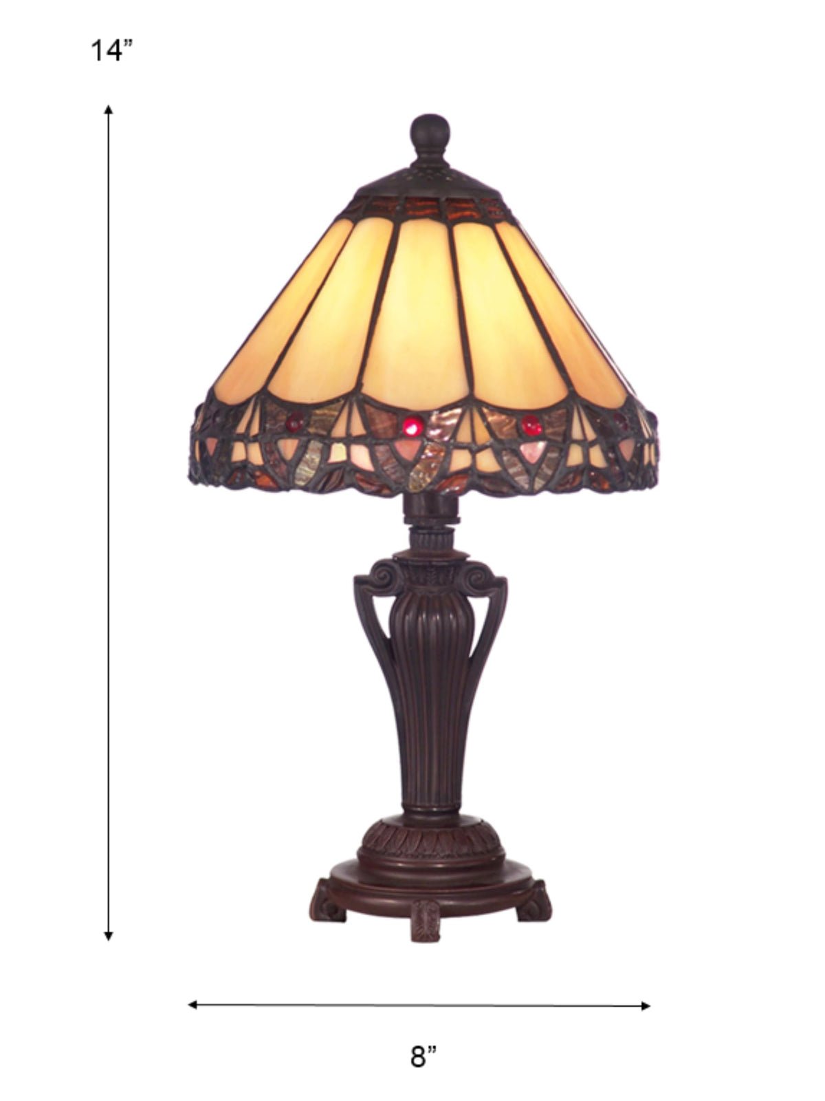 Q: What is the size of the Dale Tiffany Peacock Accent Lamp?A: The lamp measures 8 inches in length and 8 inches in width, making it a perfect accent piece for tables or shelves.
