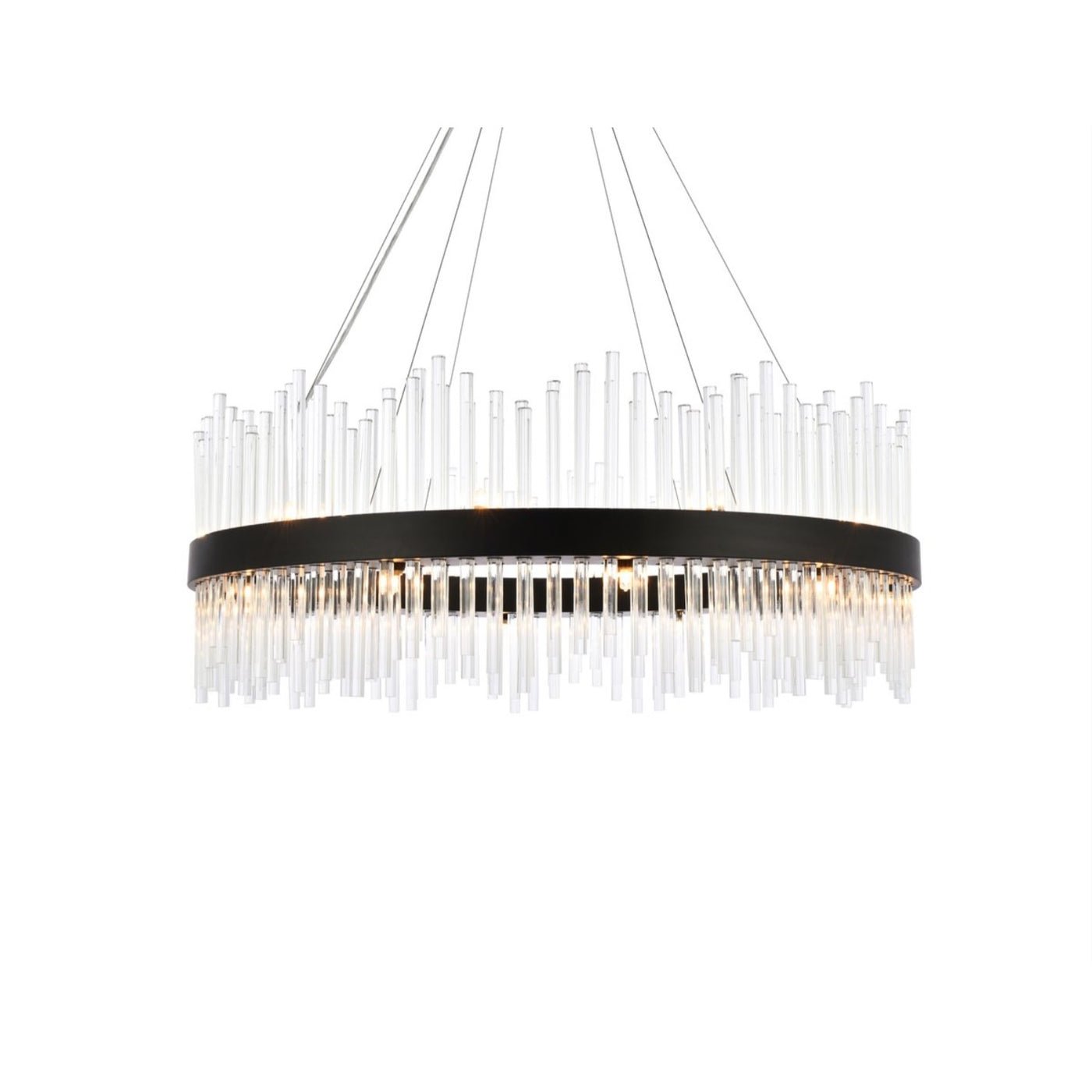 This stately fixture combines timeless elegance with modern and attractive sophistication. The delicate juxtaposition of upright and hanging clear glass rods creates a truly stunning visual statement, seamlessly woven together within a sleek bold metal frame. This expressive piece would be a welcomed and treasured addition to a wide range of modern residential styles.