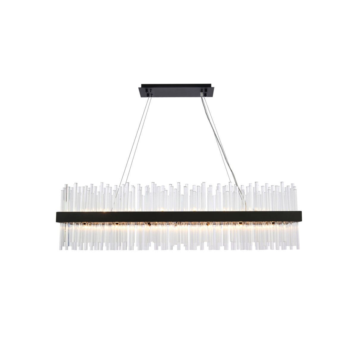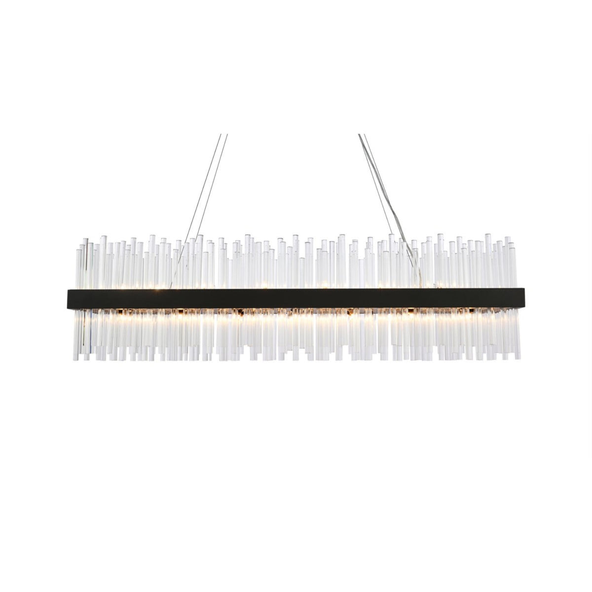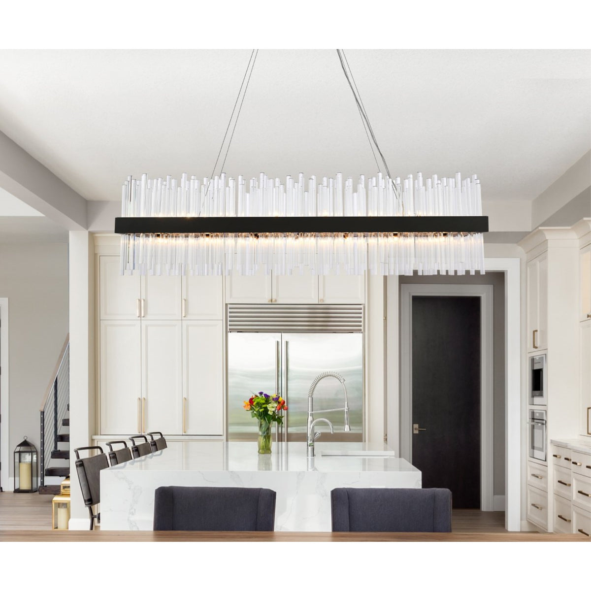 This stately fixture combines timeless elegance with modern and attractive sophistication. The delicate juxtaposition of upright and hanging clear glass rods creates a truly stunning visual statement, seamlessly woven together within a sleek bold metal frame. This expressive piece would be a welcomed and treasured addition to a wide range of modern residential styles.